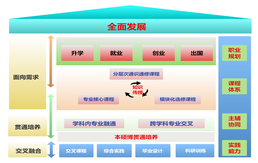 首先,持续探索“面向需求-贯通培养-交叉融合”的育人模式,支撑全面发展。一是面向经济社会发展对人才培养的要求,实施“先宽后深”的“通识通修+专业培养+全面发展”模式,结合学生升学、就业、创业和出国等不同未来职业发展规划,构建匹配的分流培养课程模块和分层次教学改革方案,实现教学资源的有效供给。二是加强学科专业之间的资源关联,深化“辅修+微专业”教学模式,构建“本-硕-博”贯通培养的课程衔接机制,形成《云博app官方在线入口本研贯通人才培养计划实施办法》。三是依托本科专业培养方案,构建“学科内部专业融通+跨学科专业交叉融合”的课程体系,推动有组织、制度化、规模性的破壁交叉。