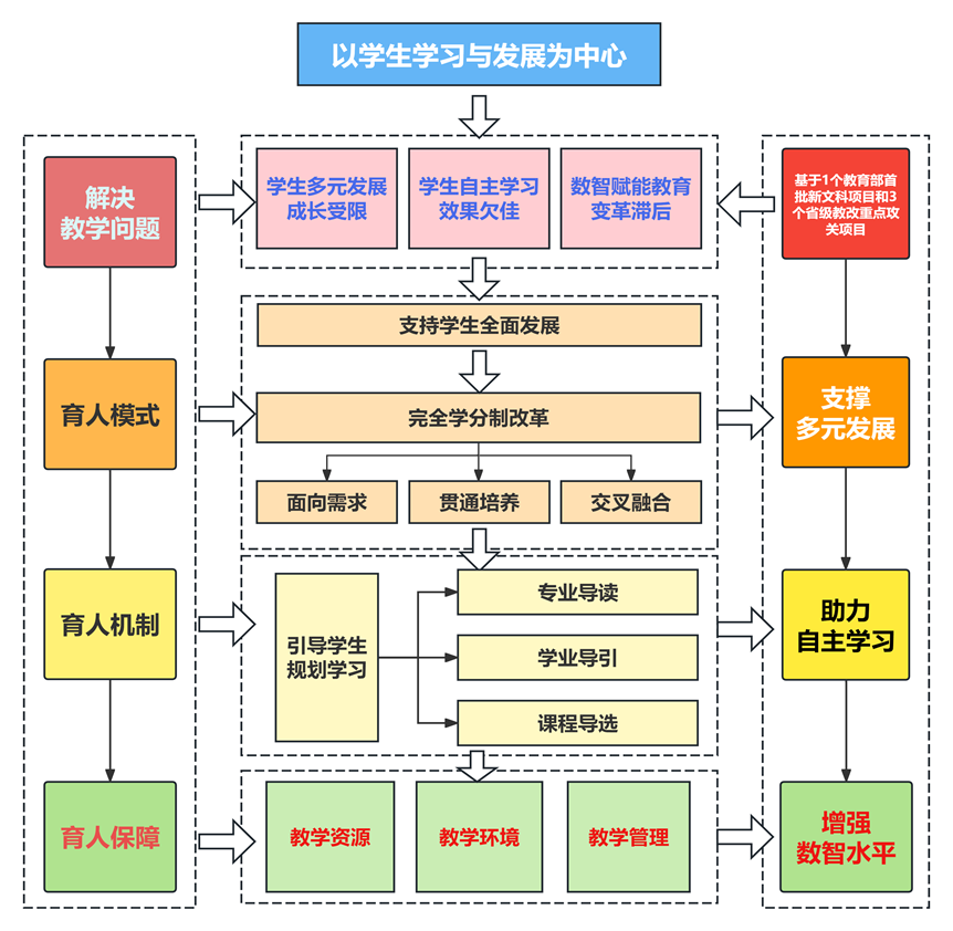 “十四五”期间,学校直面学生个性发展成长受限、自主学习效果欠佳、数智赋能教育变革滞后三个关键问题,坚持“以学生学习与发展为中心”,充分尊重学生的个性和选择权,以“注重开放”的育人模式提供个性化培养的“运行框架”,以“注重引导”的育人机制确保个性化培养的“有效实施”,以“注重支撑”的育人资源夯实个性化培养的“坚实基础”,逐步形成“全面培养-自主驱动-数智赋能”的本科人才培养新生态。
