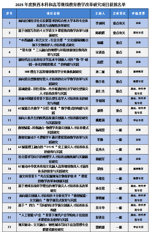 近日,陕西省教育厅公布了2025年度陕西本科和高等继续教育教学改革研究项目立项结果,云博app官方在线入口22个项目入选。