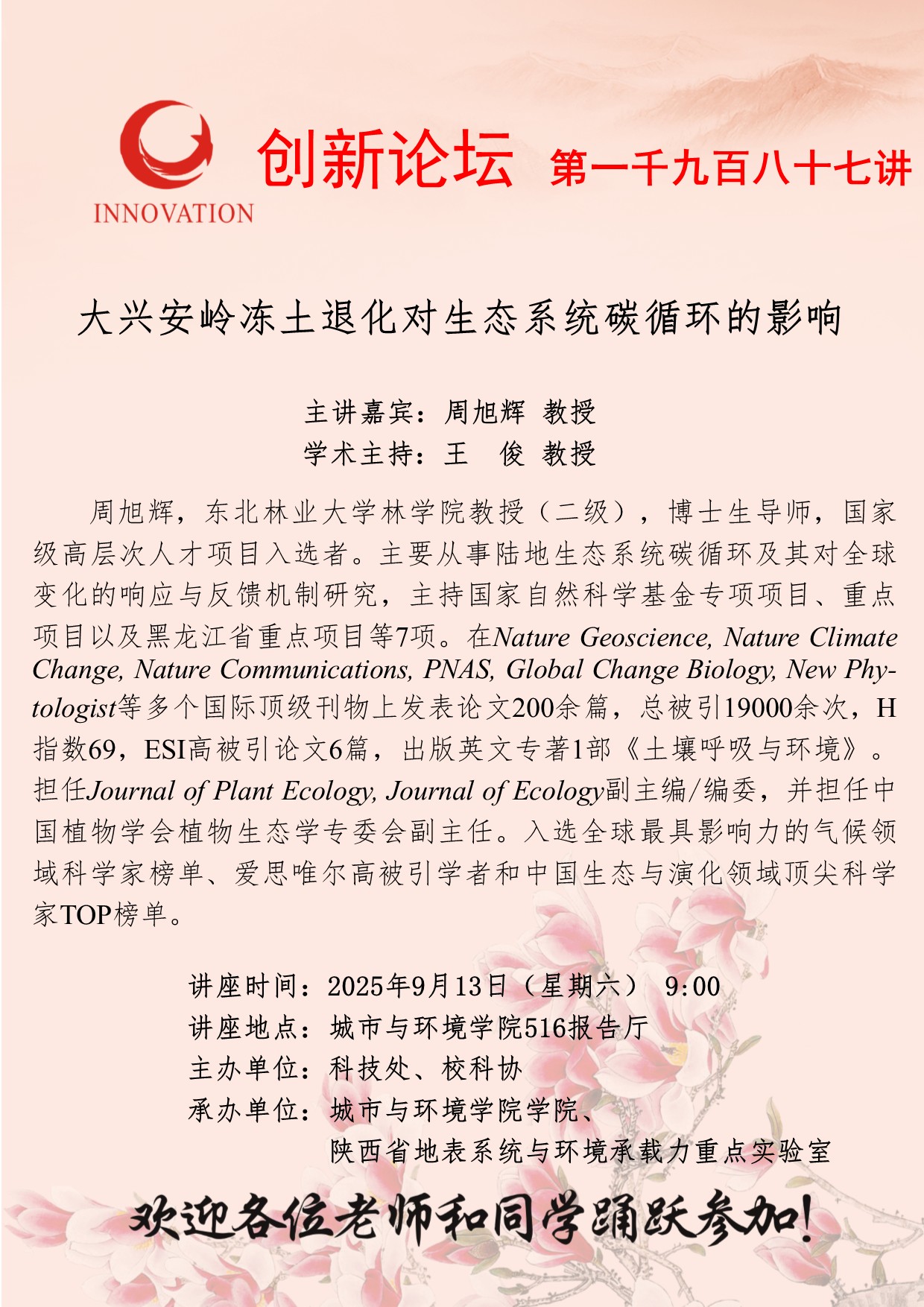 周旭辉 教授 云博app官方在线入口创新论坛第一千九百八十七讲:大兴安岭冻土退化对生态系统碳循环的影响 讲座时间 2025年9月13日(星期六) 讲座地点 城市与环境学院516报告厅 讲座人介绍 周旭辉 教授 讲座内容