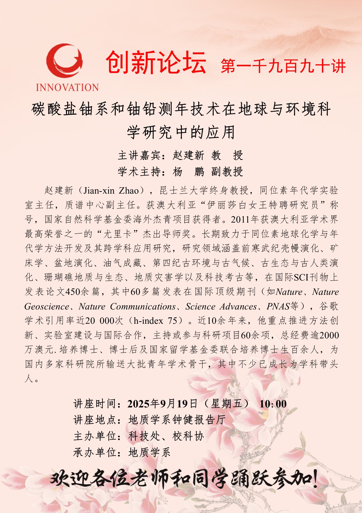 赵建新 教授 云博app官方在线入口创新论坛第一千九百九十讲:碳酸盐铀系和铀铅测年技术在地球与环境科学研究中的应用 讲座时间 2025年9月19日(星期五) 10:00 讲座地点 地质学系钟健报告厅 讲座人介绍 赵建新 教授 讲座内容