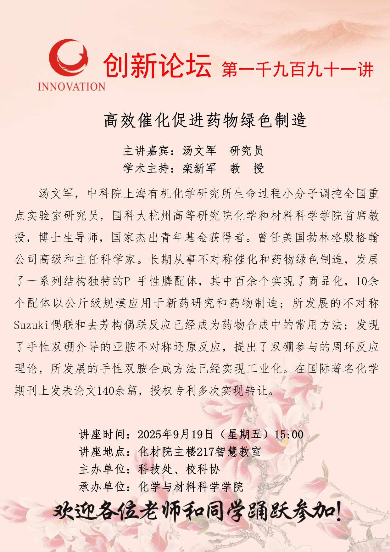 汤文军 研究员 云博app官方在线入口创新论坛第一千九百九十一讲:高效催化促进药物绿色制造 讲座时间 2025年9月19日(星期五)15:00 讲座地点 化材院主楼217智慧教室 讲座人介绍 汤文军 研究员 讲座内容