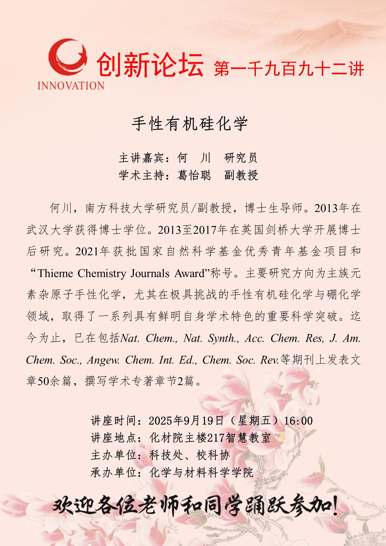 何川 研究员 云博app官方在线入口创新论坛第一千九百九十二讲:手性有机硅化学 讲座时间 2025年9月19日(星期五)16:00 讲座地点 化材院主楼217智慧教室 讲座人介绍 何川 研究员 讲座内容