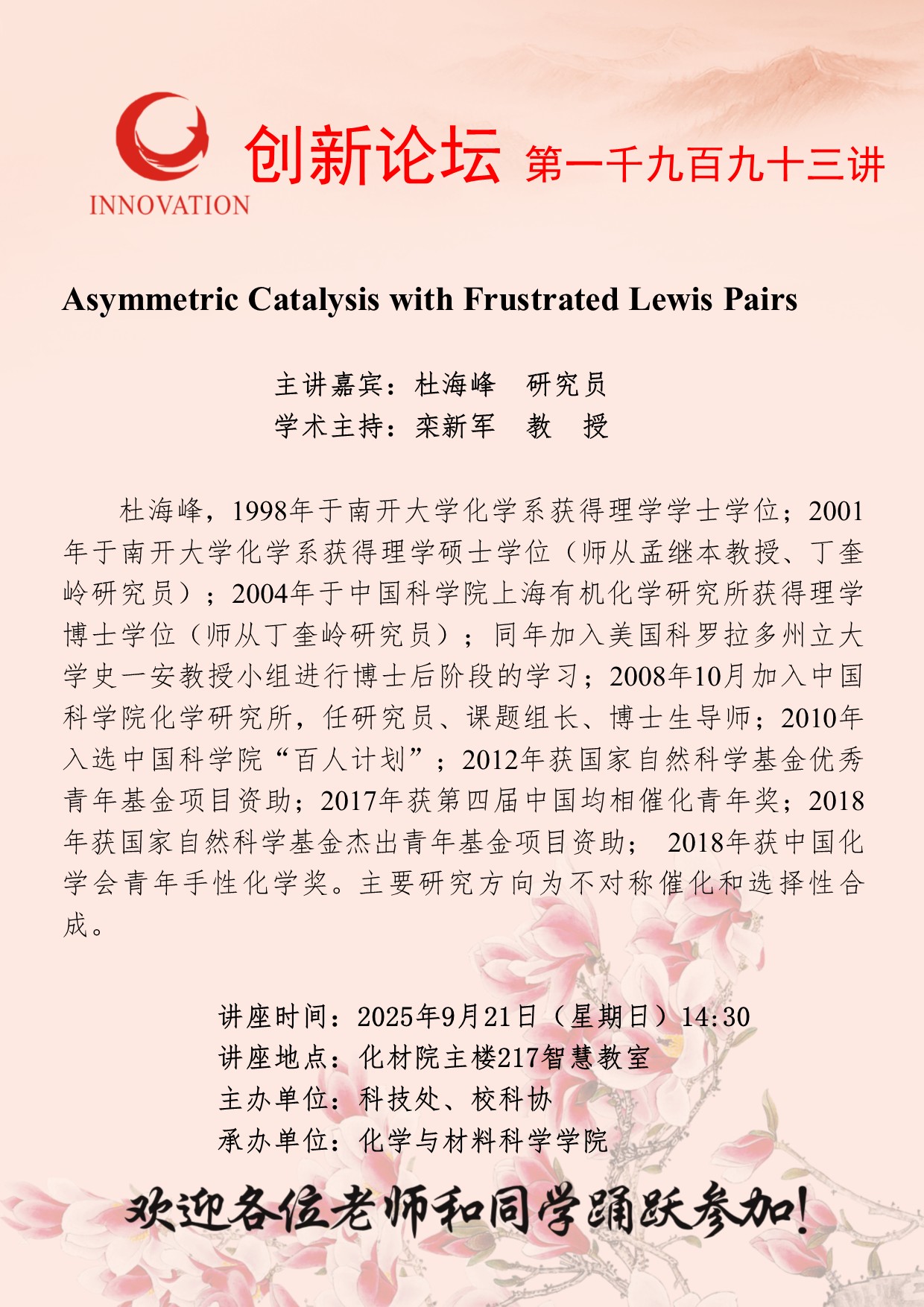 杜海峰 研究员 云博app官方在线入口创新论坛第一千九百九十三讲:Asymmetric Catalysis with Frustrated Lewis Pairs 讲座时间 2025年9月21日(星期日)14:30 讲座地点 化材院主楼217智慧教室 讲座人介绍 杜海峰 研究员 讲座内容