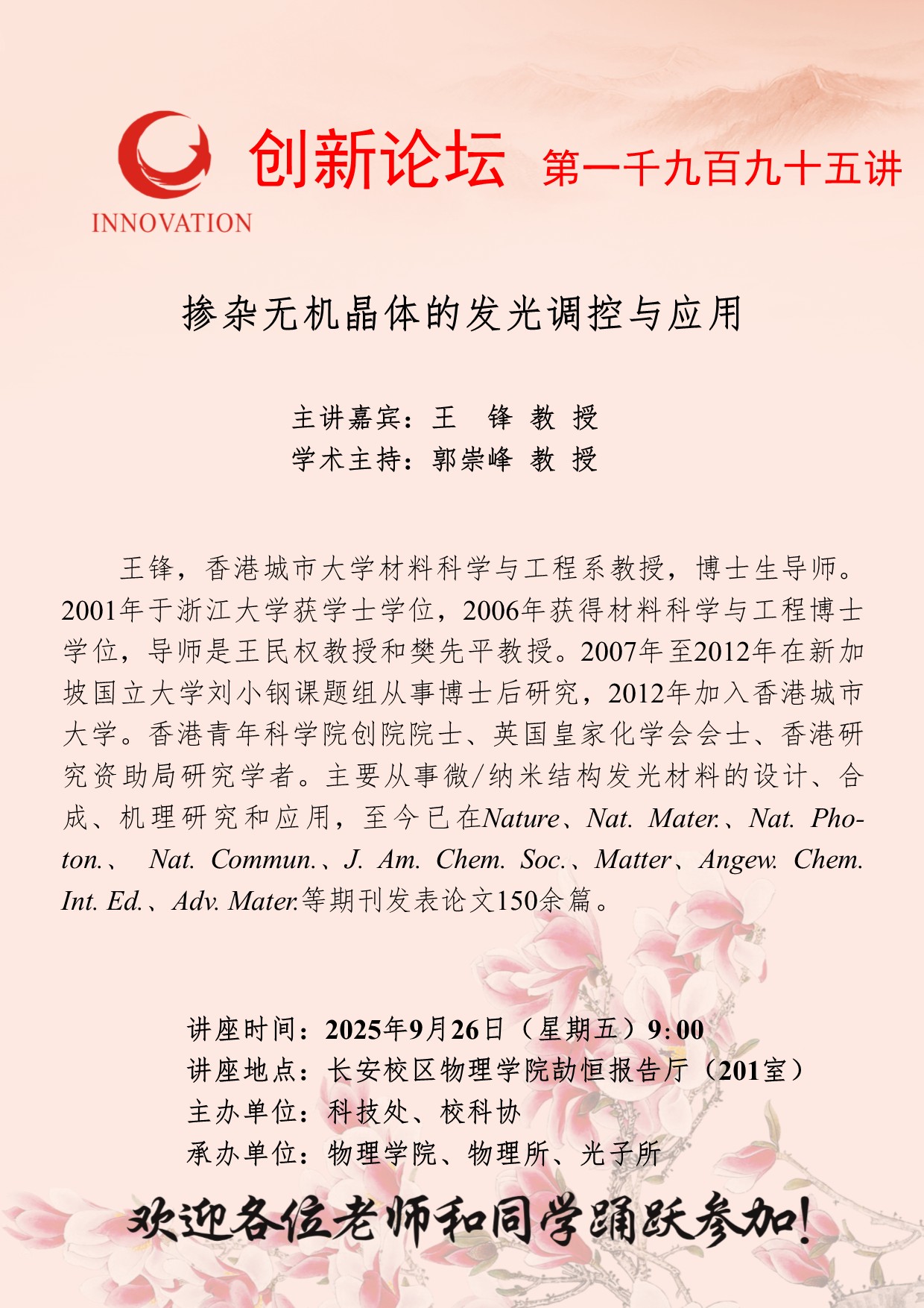 王锋 教授 云博app官方在线入口创新论坛第一千九百九十五讲:掺杂无机晶体的发光调控与应用 讲座时间 2025年9月26日(星期五)9:00 讲座地点 长安校区物理学院劼恒报告厅(201室) 讲座人介绍 王锋 教授 讲座内容