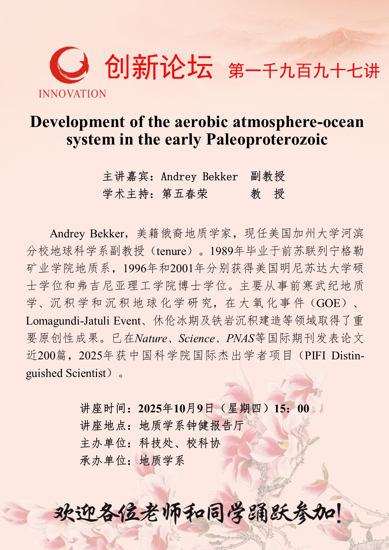 Andrey Bekker 副教授 云博app官方在线入口创新论坛第一千九百九十七讲:Development of the aerobic atmosphere-ocean system in the early Paleoproterozoic 讲座时间 2025年10月9日(星期四)15:00 讲座地点 地质学系钟健报告厅 讲座人介绍 Andrey Bekker 副教授 讲座内容