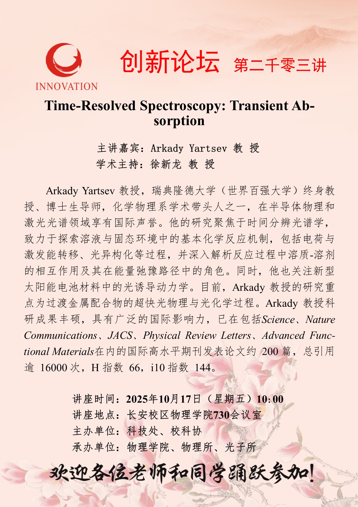 Arkady Yartsev 教授 云博app官方在线入口创新论坛第二千零三讲:Time-Resolved Spectroscopy: Transient Absorption 讲座时间 2025年10月17日(星期五)10:00 讲座地点 长安校区物理学院730会议室 讲座人介绍 Arkady Yartsev 教授 讲座内容