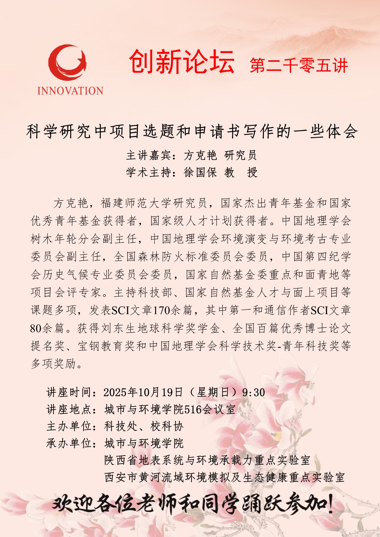 方克艳 研究员 云博app官方在线入口创新论坛第二千零五讲:科学研究中项目选题和申请书写作的一些体会 讲座时间 2025年10月19日(星期日)9:30 讲座地点 城市与环境学院516会议室 讲座人介绍 方克艳 研究员 讲座内容