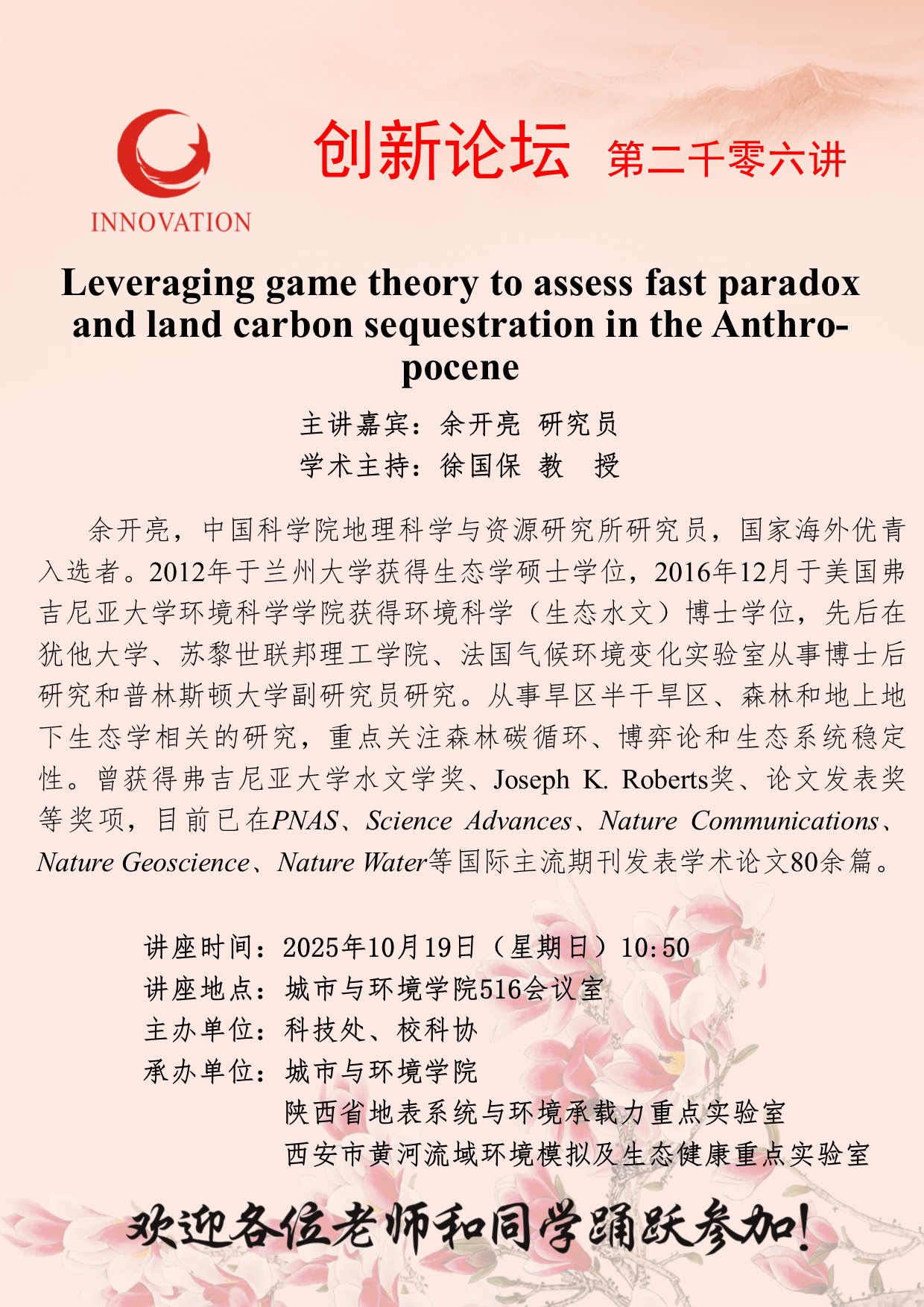 余开亮 研究员 云博app官方在线入口创新论坛第二千零六讲:Leveraging game theory to assess fast paradoxand land carbon sequestration in the Anthro-pocene 讲座时间 2025年10月19日(星期日)10:50 讲座地点 城市与环境学院516会议室 讲座人介绍 余开亮 研究员 讲座内容