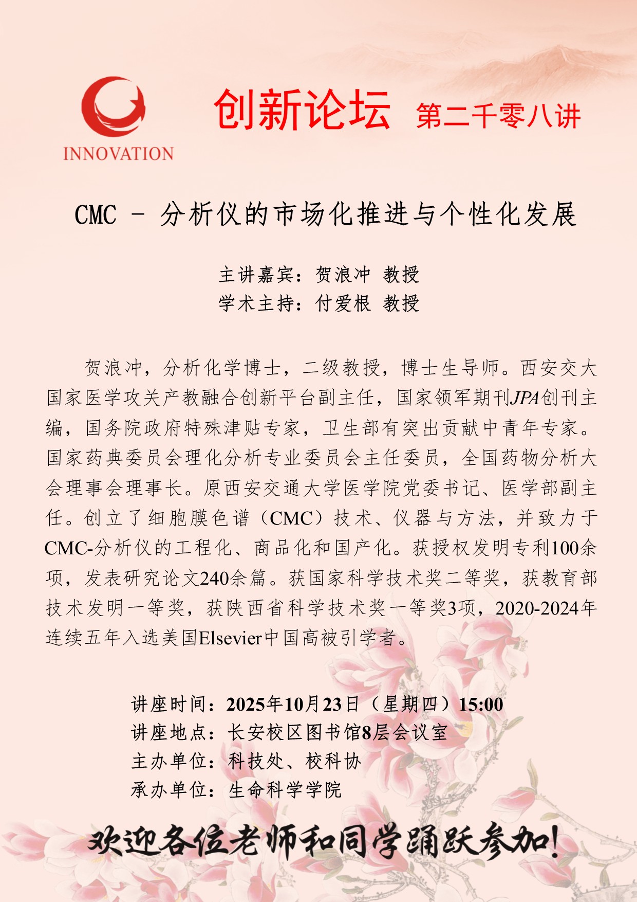 贺浪冲 教授 云博app官方在线入口创新论坛第二千零八讲:CMC - 分析仪的市场化推进与个性化发展 讲座时间 2025年10月23日(星期四)15:00 讲座地点 讲座地点:长安校区图书馆8层会议室 讲座人介绍 贺浪冲 教授 讲座内容