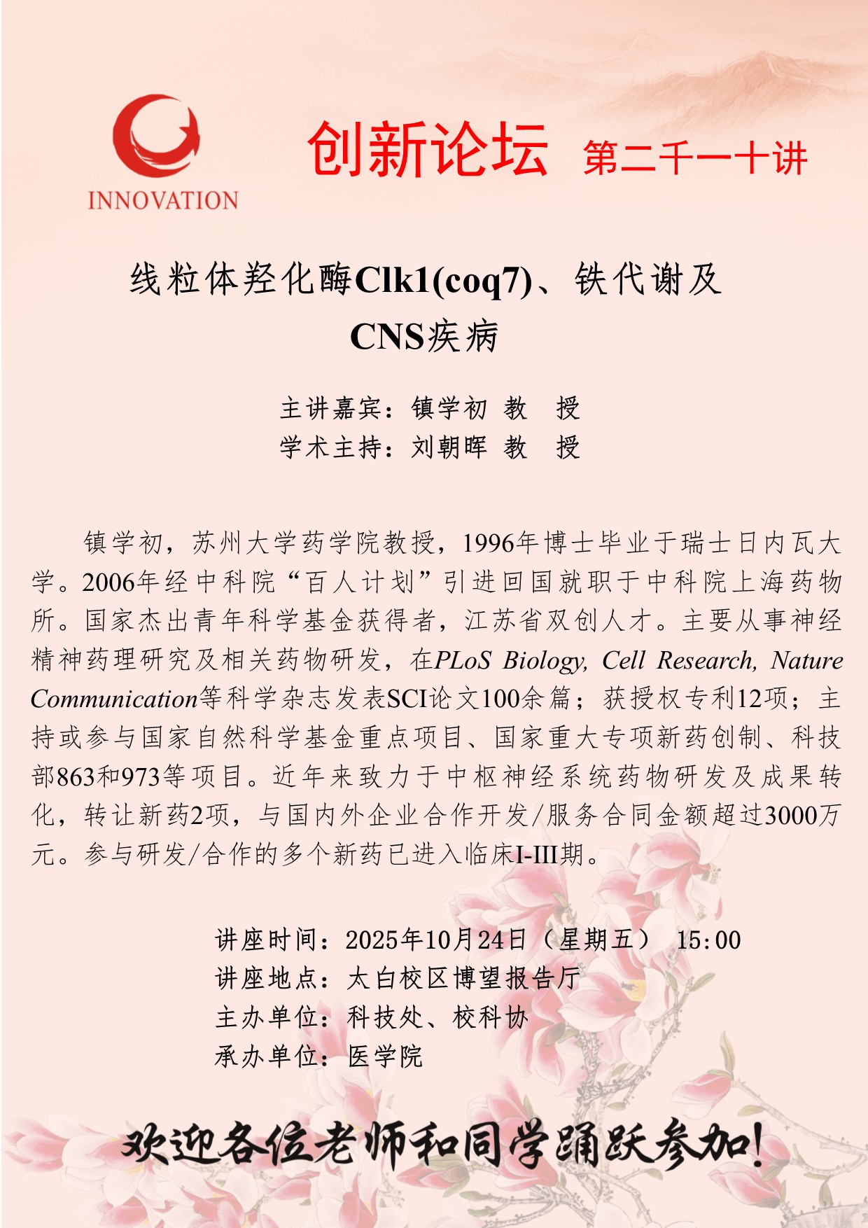 镇学初 教授 云博app官方在线入口创新论坛第二千一十讲:线粒体羟化酶Clk1(coq7)、铁代谢及CNS疾病 讲座时间 2025年10月24日(星期五) 15:00 讲座地点 太白校区博望报告厅 讲座人介绍 镇学初 教授 讲座内容