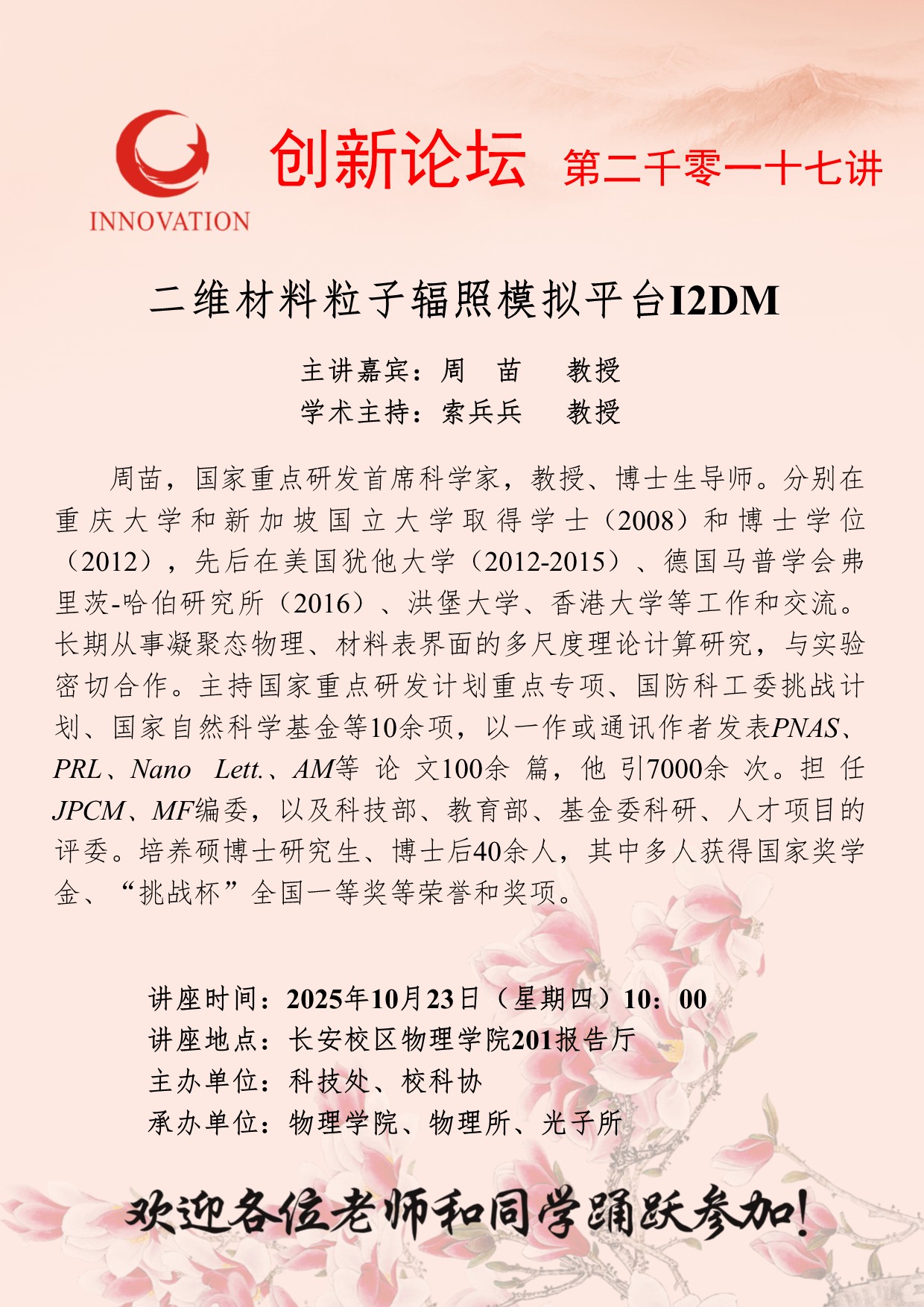 周苗 教授 云博app官方在线入口创新论坛第二千零一十七讲:二维材料粒子辐照模拟平台I2DM 讲座时间 2025年10月23日(星期四)10:00 讲座地点 长安校区物理学院201报告厅 讲座人介绍 周苗 教授 讲座内容