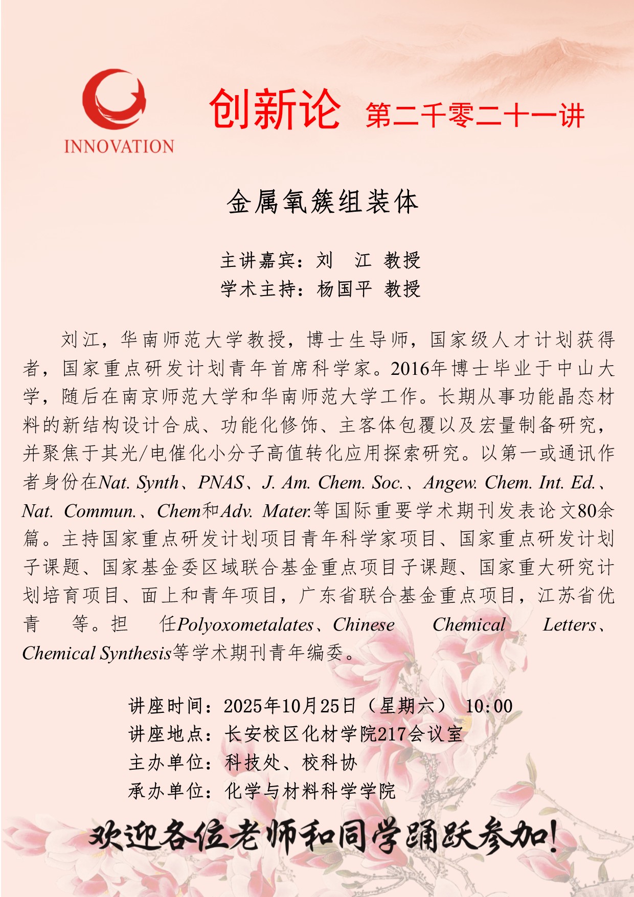 刘 江 教授 云博app官方在线入口创新论坛第二千零二十一讲:金属氧簇组装体 讲座时间 2025年10月25日(星期六) 10:00 讲座地点 长安校区化材学院217会议室 讲座人介绍 刘 江 教授 讲座内容