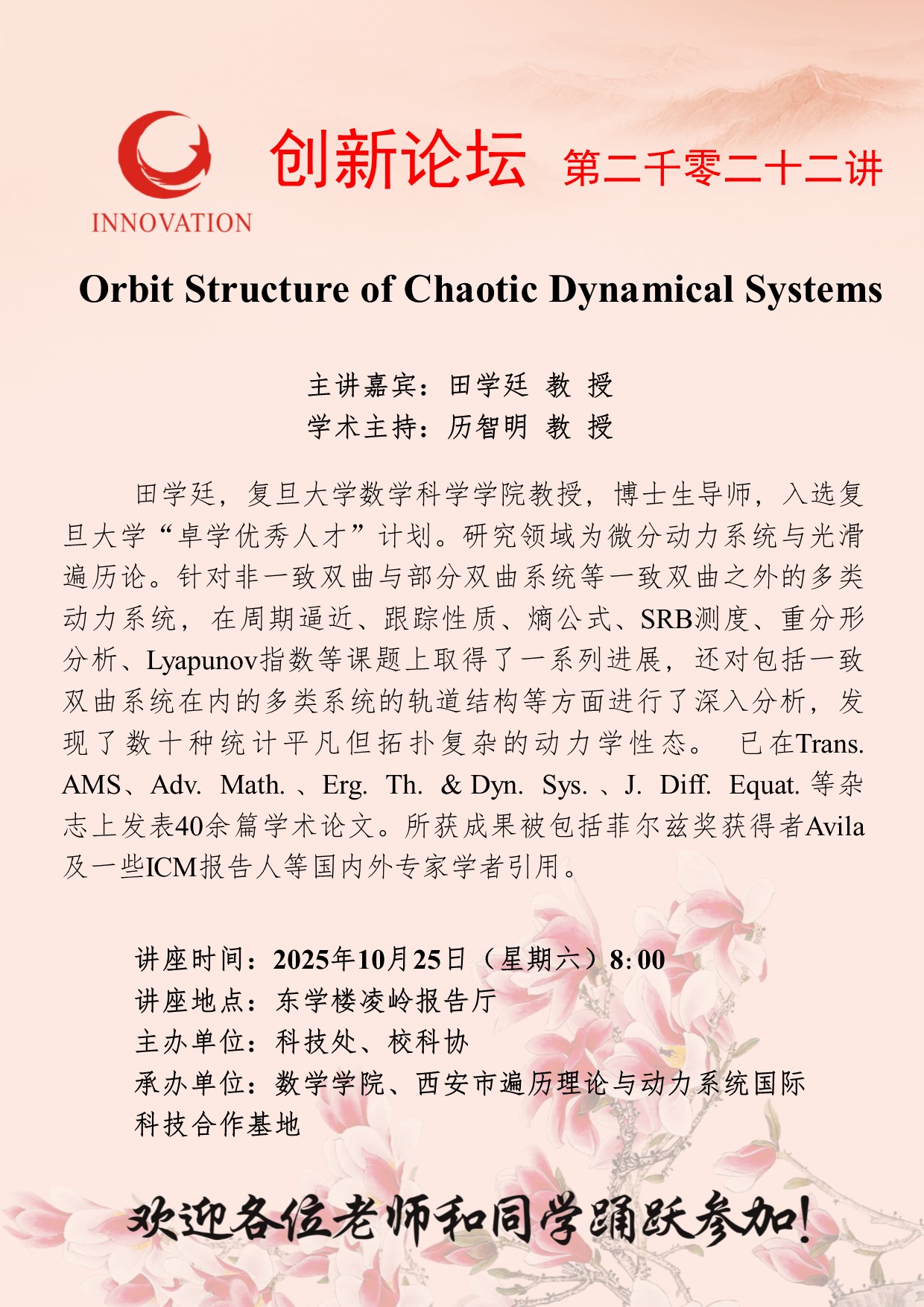 田学廷 教 授 云博app官方在线入口创新论坛第二千零二十二讲:Orbit Structure of Chaotic Dynamical Systems 讲座时间 2025年10月25日(星期六)8:00 讲座地点 东学楼凌岭报告厅 讲座人介绍 田学廷 教 授 讲座内容