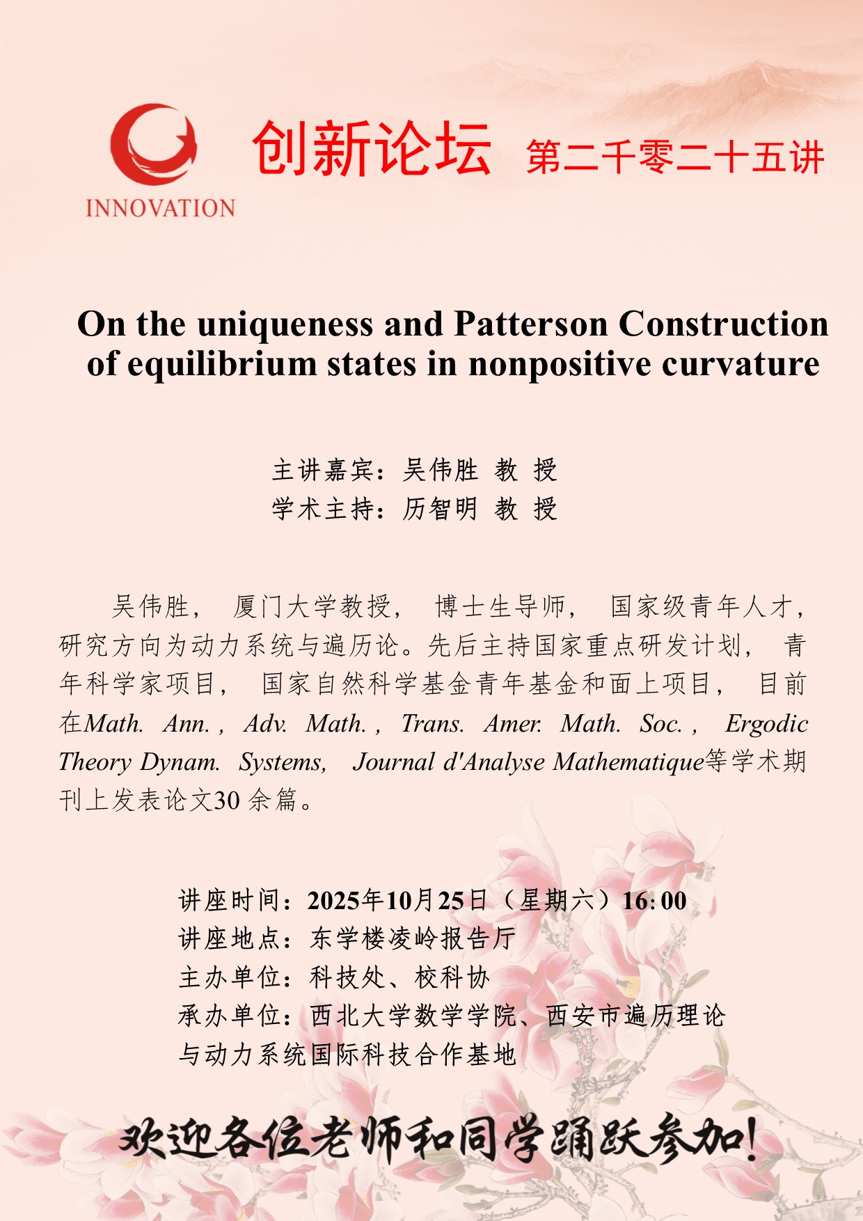 吴伟胜 教 授 云博app官方在线入口创新论坛第二千零二十五讲:On the uniqueness and Patterson Construction of equilibrium states in nonpositive curvature 讲座时间 2025年10月25日(星期六)16:00 讲座地点 东学楼凌岭报告厅 讲座人介绍 吴伟胜 教 授 讲座内容