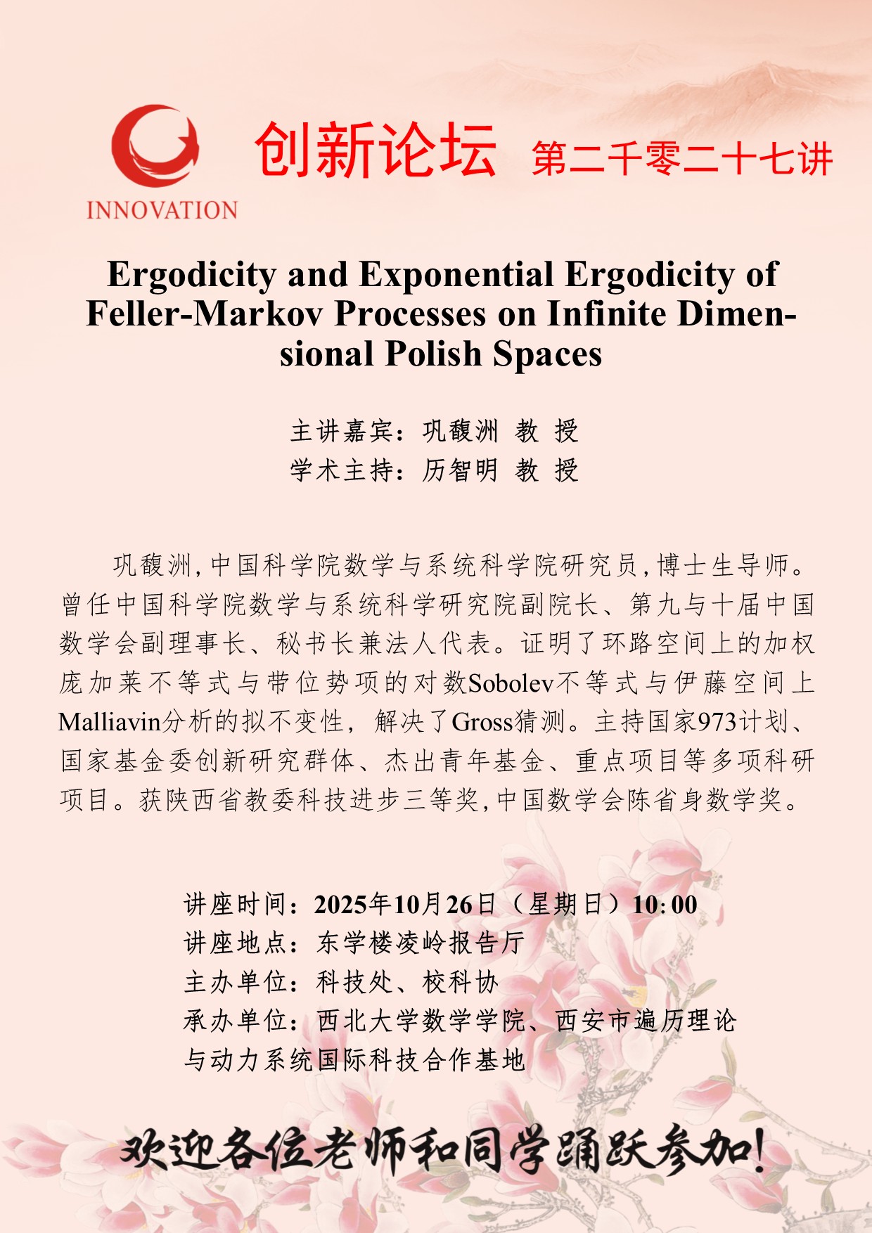 巩馥洲 教 授 云博app官方在线入口创新论坛第二千零二十七讲:Ergodicity and Exponential Ergodicity of Feller-Markov Processes on Infinite Dimensional Polish Spaces 讲座时间 2025年10月26日(星期日)10:00 讲座地点 东学楼凌岭报告厅 讲座人介绍 巩馥洲 教 授 讲座内容