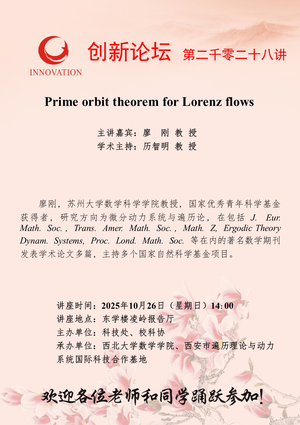 廖 刚 教 授 云博app官方在线入口创新论坛第二千零二十八讲:Prime orbit theorem for Lorenz flows 讲座时间 2025年10月26日(星期日)14:00 讲座地点 东学楼凌岭报告厅 讲座人介绍 廖 刚 教 授 讲座内容
