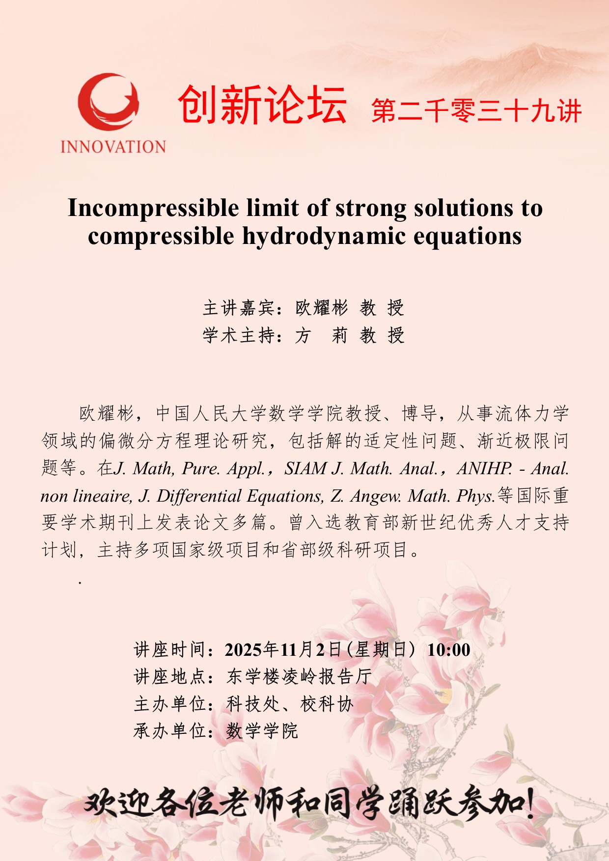 欧耀彬 教 授 云博app官方在线入口创新论坛第二千零三十九讲:Incompressible limit of strong solutions to compressible hydrodynamic equations 讲座时间 2025年11月2日(星期日) 10:00 讲座地点 东学楼凌岭报告厅 讲座人介绍 欧耀彬 教 授 讲座内容