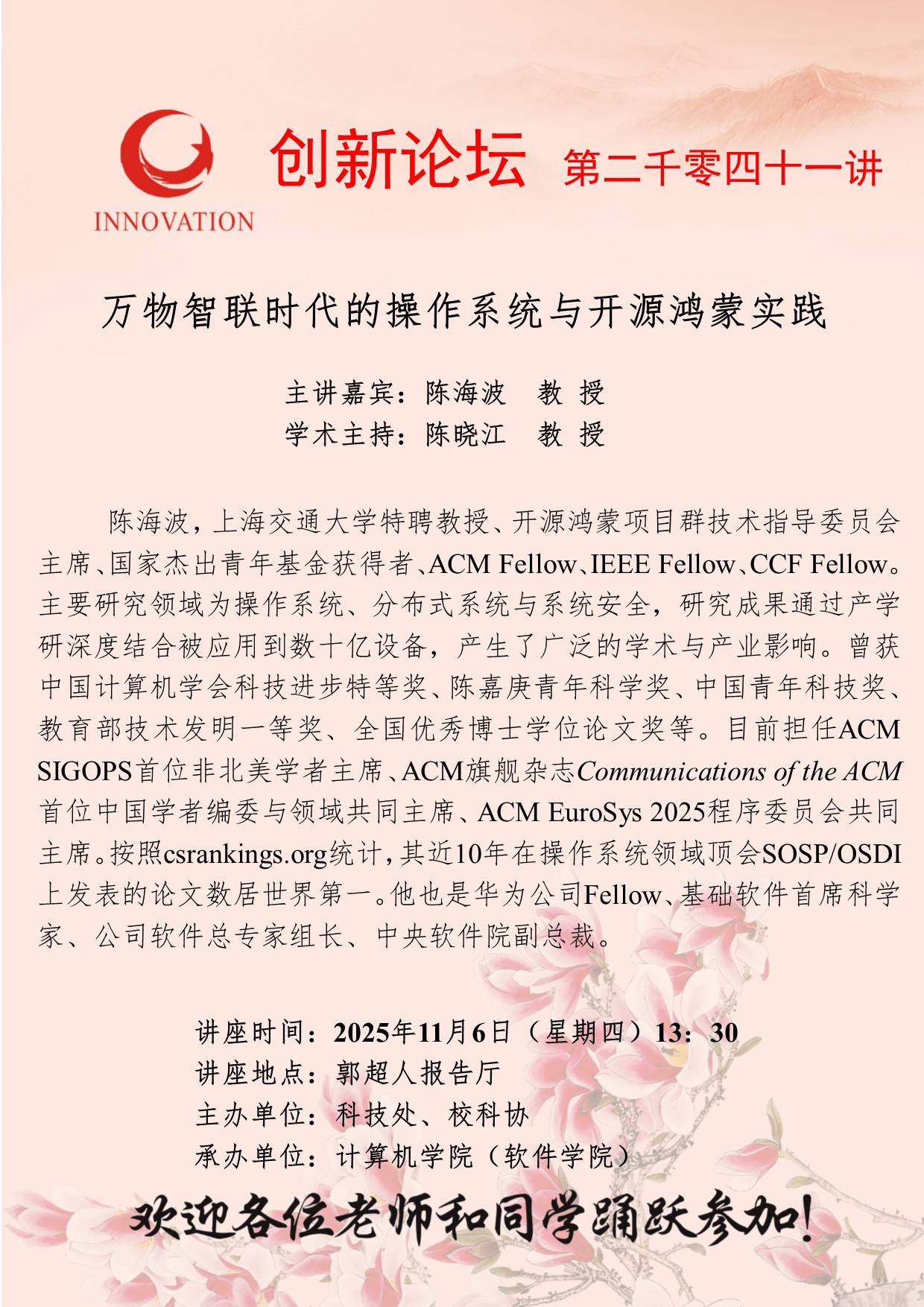 陈海波 教授 云博app官方在线入口创新论坛第二千零四十一讲:万物智联时代的操作系统与开源鸿蒙实践 讲座时间 2025年11月6日(星期四)13:30 讲座地点 郭超人报告厅 讲座人介绍 陈海波 教授 讲座内容