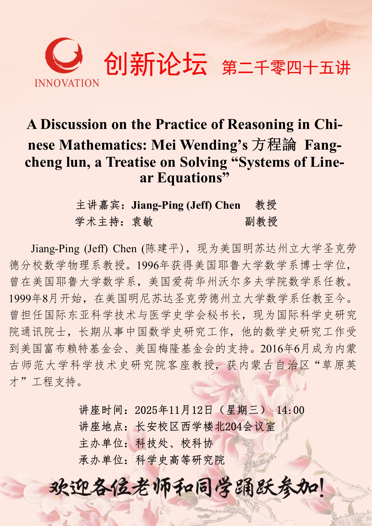 Jiang-Ping (Jeff) Chen 教授 云博app官方在线入口创新论坛第二千零四十五讲:A Discussion on the Practice of Reasoning in Chinese Mathematics: Mei Wending’s 方程論 Fangcheng lun, a Treatise on Solving “Systems of Linear Equations” 讲座时间 2025年11月12日(星期三) 14:00 讲座地点 长安校区西学楼北204会议室 讲座人介绍 Jiang-Ping (Jeff) Chen 教授 讲座内容