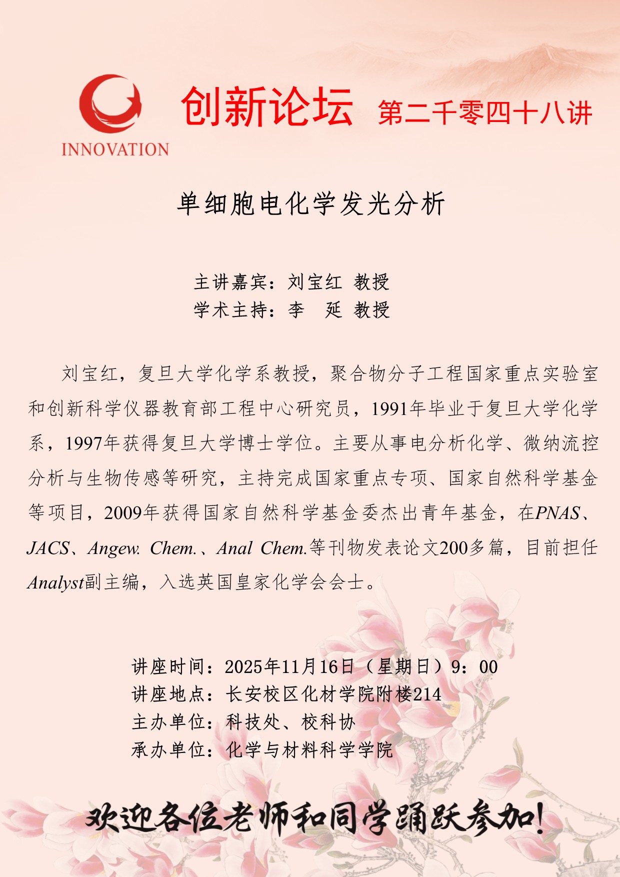 刘宝红 教授 云博app官方在线入口创新论坛第二千零四十八讲:单细胞电化学发光分析 讲座时间 2025年11月16日(星期日)9:00 讲座地点 长安校区化材学院附楼214 讲座人介绍 刘宝红 教授 讲座内容