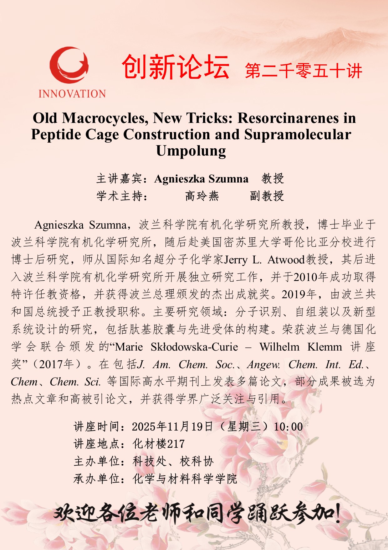 Agnieszka Szumna 教授 云博app官方在线入口创新论坛第二千零五十讲:Old Macrocycles, New Tricks: Resorcinarenes in Peptide Cage Construction and Supramolecular Umpolung 讲座时间 2025年11月19日(星期三)10:00 讲座地点 化材楼217 讲座人介绍 Agnieszka Szumna 教授 讲座内容