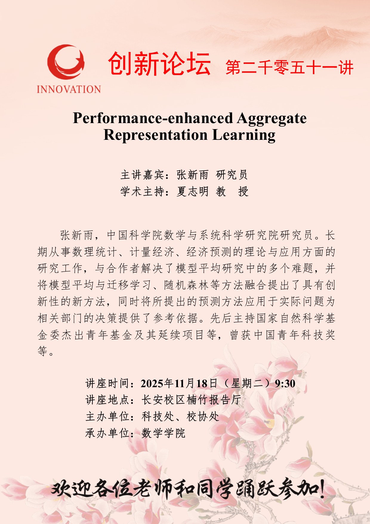 张新雨 研究员 云博app官方在线入口创新论坛第二千零五十一讲:Performance-enhanced Aggregate Representation Learning 讲座时间 2025年11月18日(星期二)9:30 讲座地点 长安校区楠竹报告厅 讲座人介绍 张新雨 研究员 讲座内容