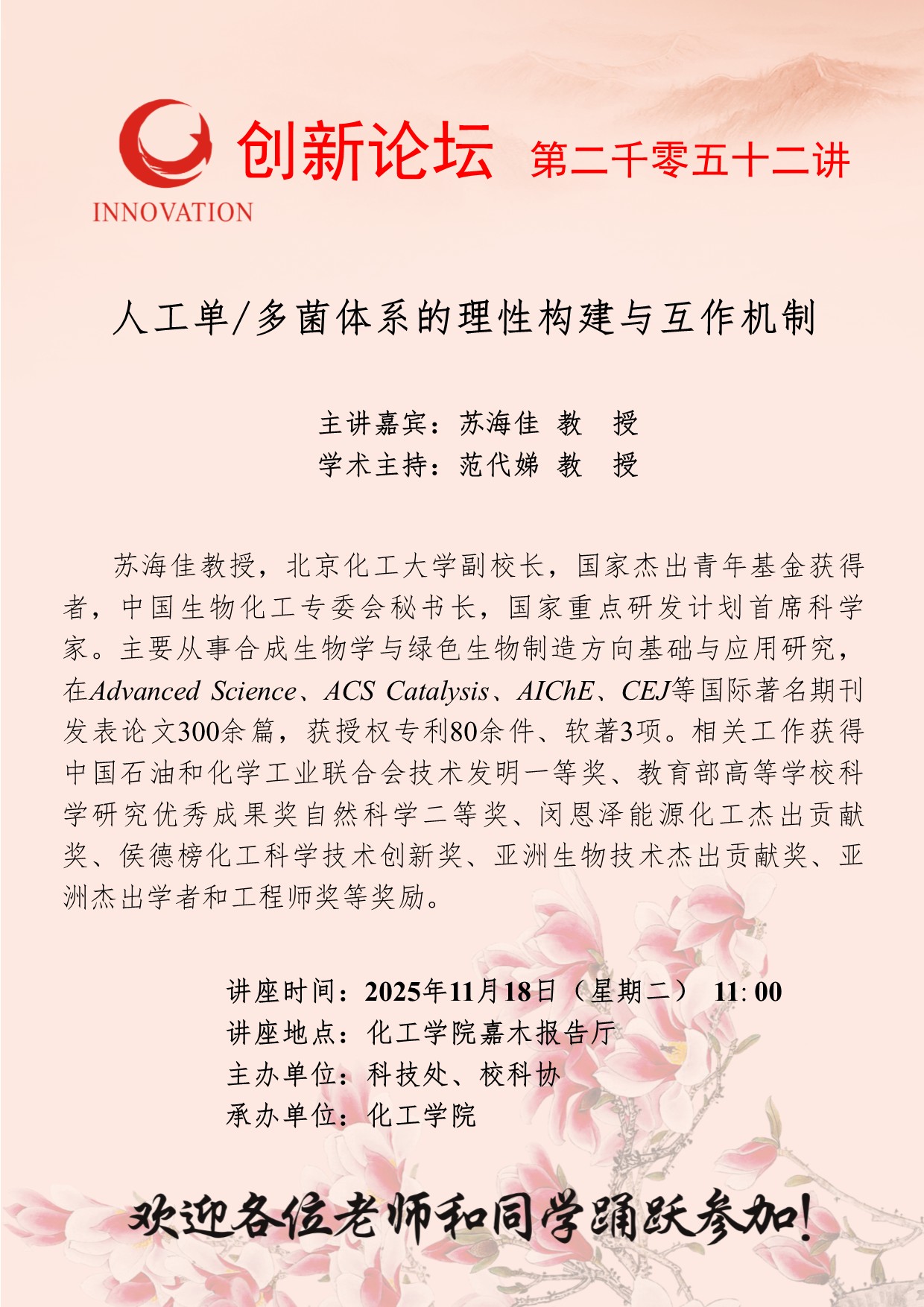 苏海佳 教授 云博app官方在线入口创新论坛第二千零五十二讲:人工单/多菌体系的理性构建与互作机制 讲座时间 2025年11月18日(星期二) 11: 00 讲座地点 化工学院嘉木报告厅 讲座人介绍 苏海佳 教授 讲座内容