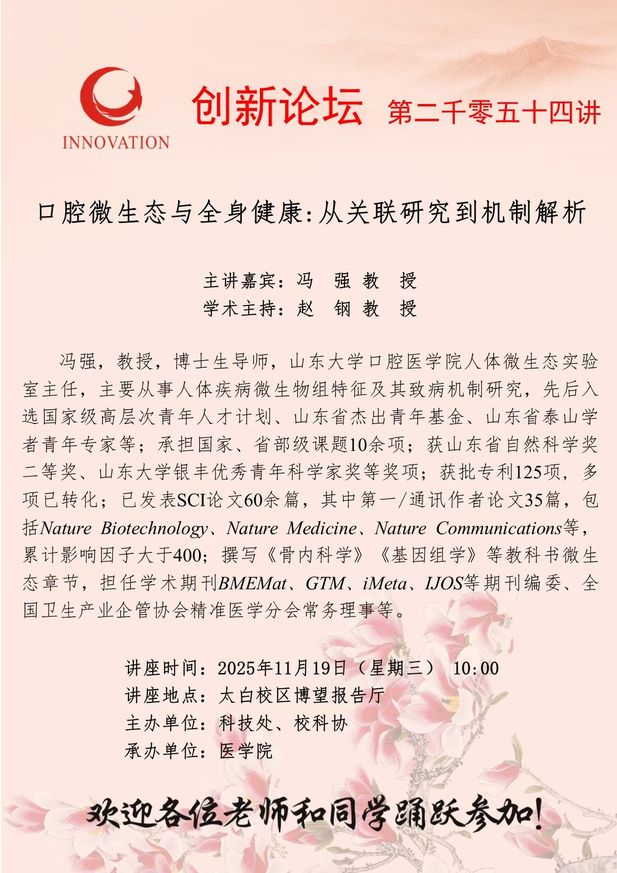 冯强 教授 云博app官方在线入口创新论坛第二千零五十四讲:口腔微生态与全身健康:从关联研究到机制解析 讲座时间 2025年11月19日(星期三) 10:00 讲座地点 太白校区博望报告厅 讲座人介绍 冯强 教授 讲座内容