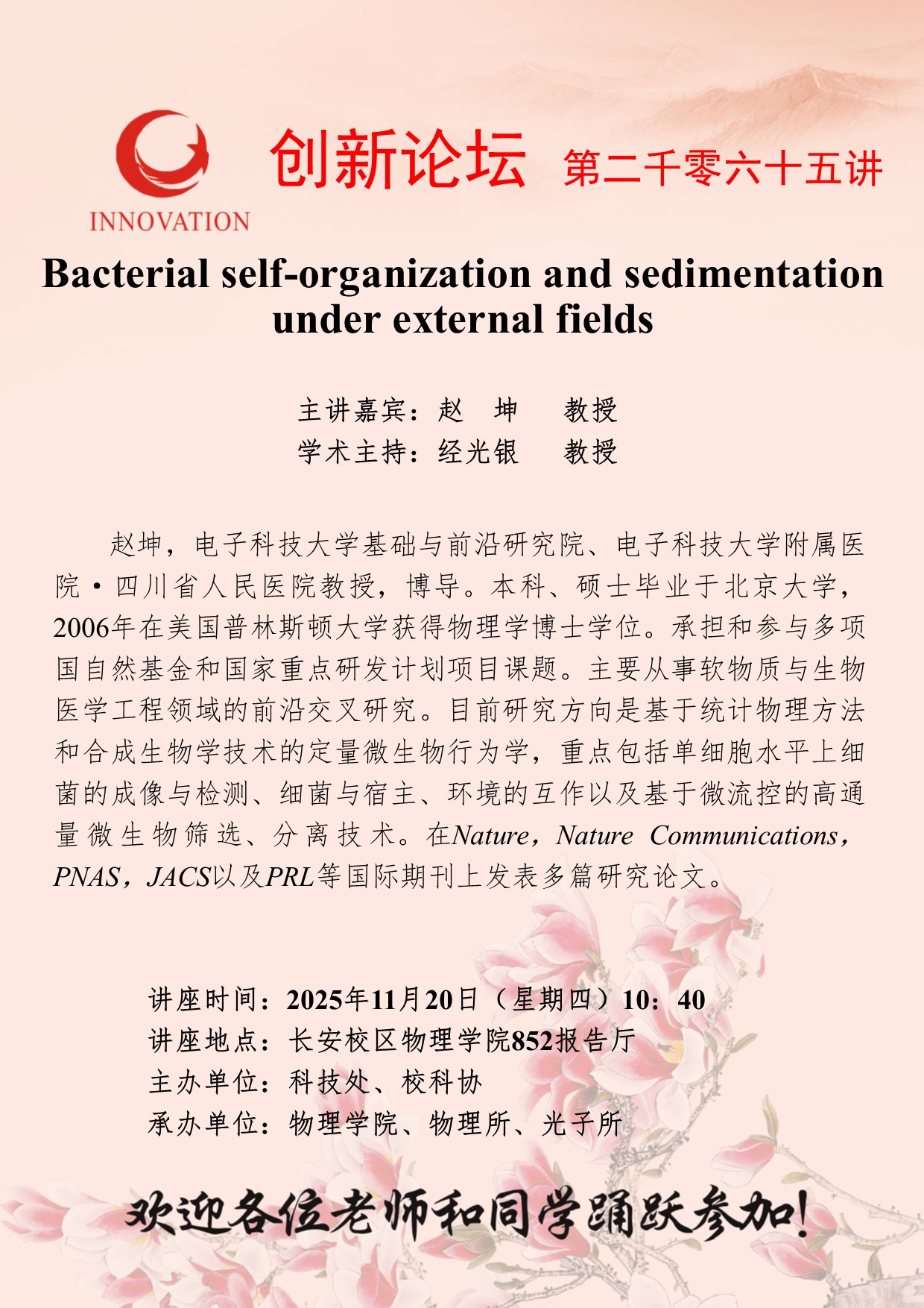 赵坤 教授 云博app官方在线入口创新论坛第二千零六十五讲:Bacterial self-organization and sedimentation under external fields 讲座时间 2025年11月20日(星期四)10:40 讲座地点 长安校区物理学院852报告厅 讲座人介绍 赵坤 教授 讲座内容