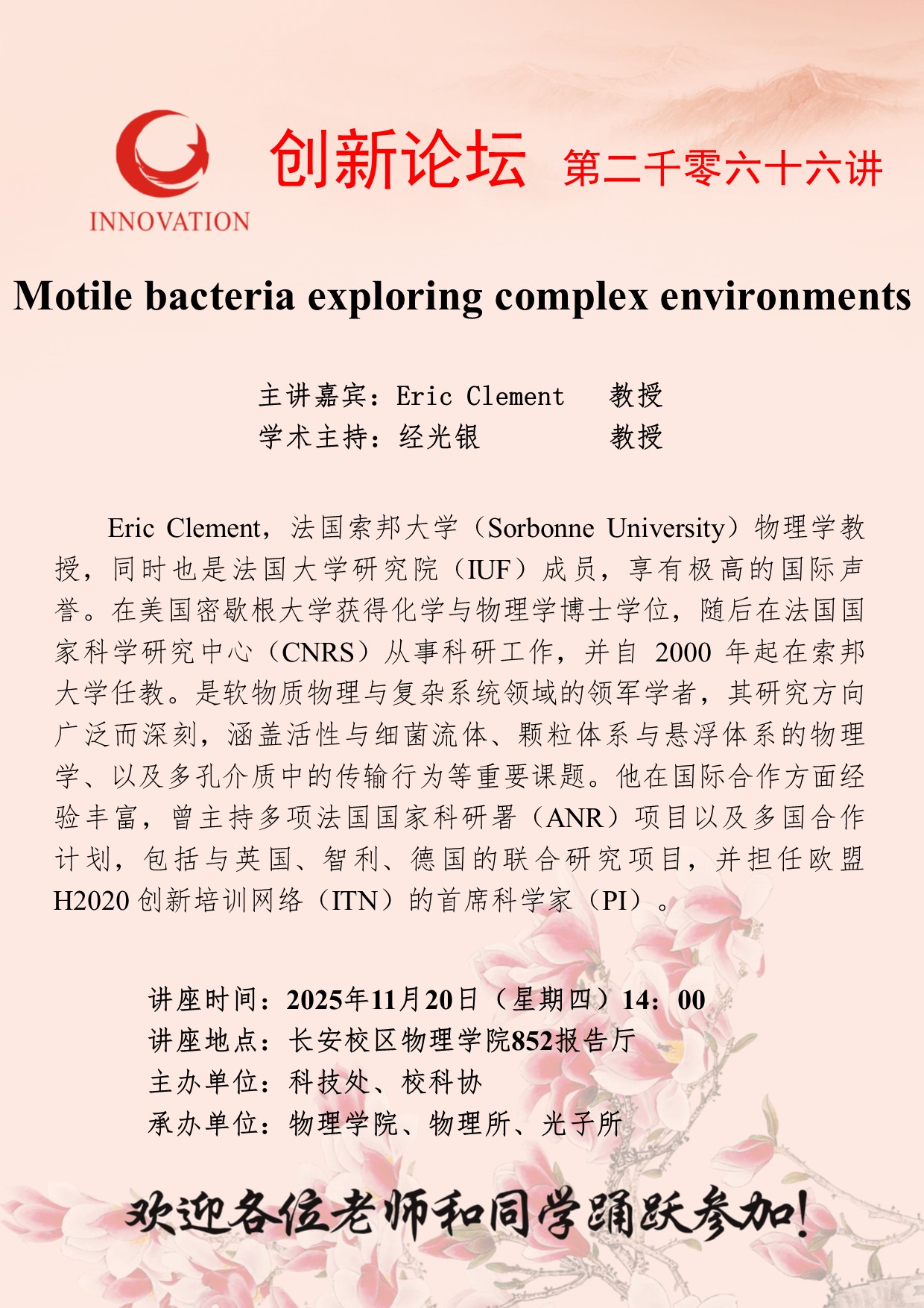Eric Clement 教授 云博app官方在线入口创新论坛第二千零六十六讲:Motile bacteria exploring complex environments 讲座时间 2025年11月20日(星期四)14:00 讲座地点 长安校区物理学院852报告厅 讲座人介绍 Eric Clement 教授 讲座内容