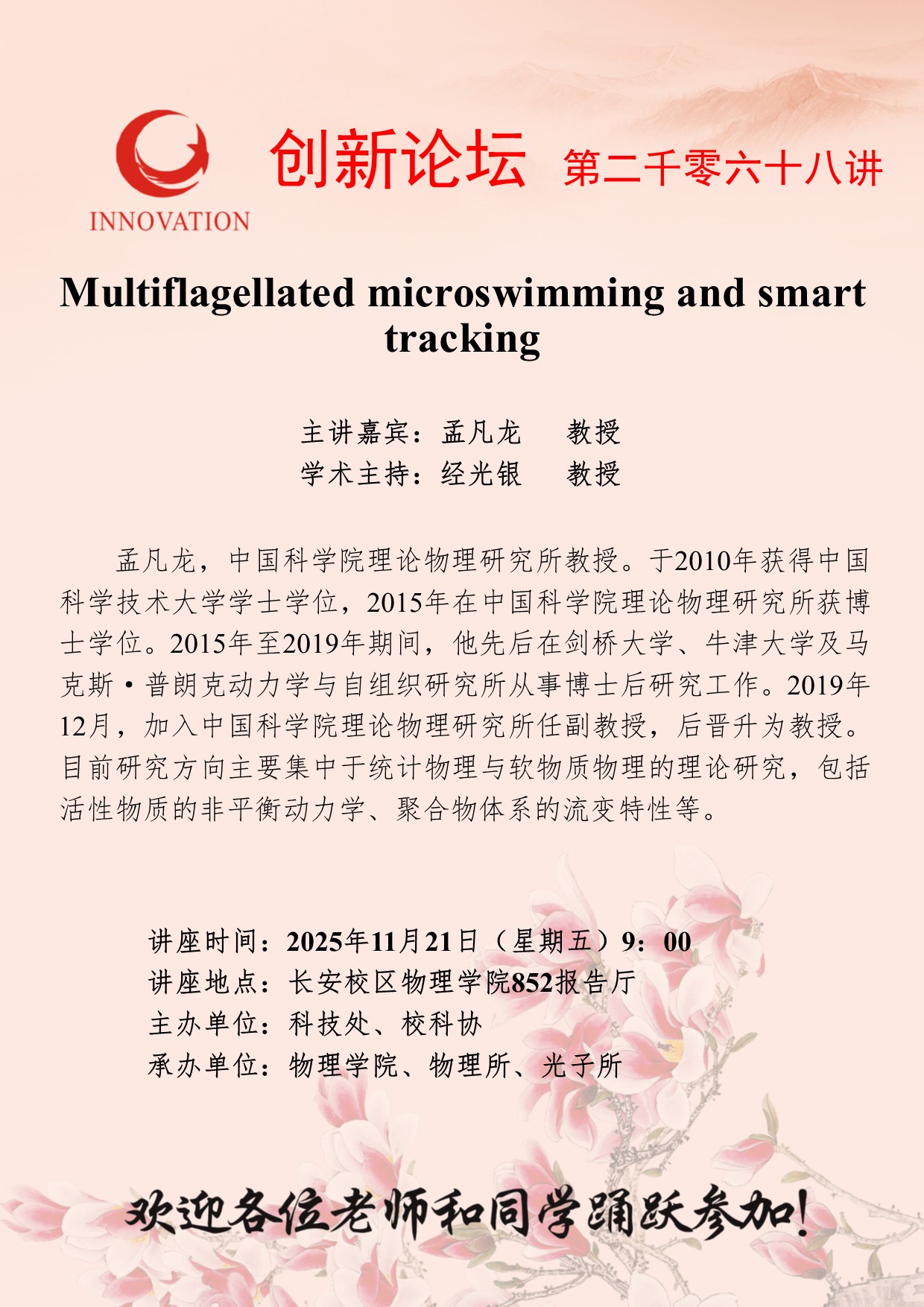孟凡龙 教授 云博app官方在线入口创新论坛第二千零六十八讲:Multiflagellated microswimming and smart tracking 讲座时间 2025年11月21日(星期五)9:00 讲座地点 长安校区物理学院852报告厅 讲座人介绍 孟凡龙 教授 讲座内容