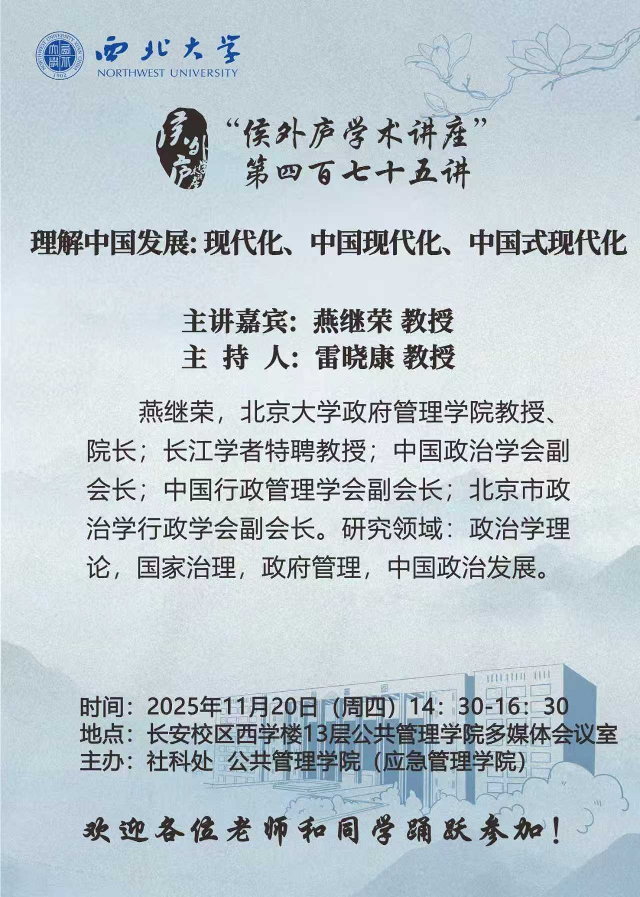 燕继荣 教授 “侯外庐学术讲座”第四百七十五讲:理解中国发展:现代化、中国现代化、中国式现代化 讲座时间 2025年11月20日((周四)14:30-16:30 讲座地点 西学楼13层公共管理学院多媒体会议室 讲座人介绍 燕继荣 教授 讲座内容