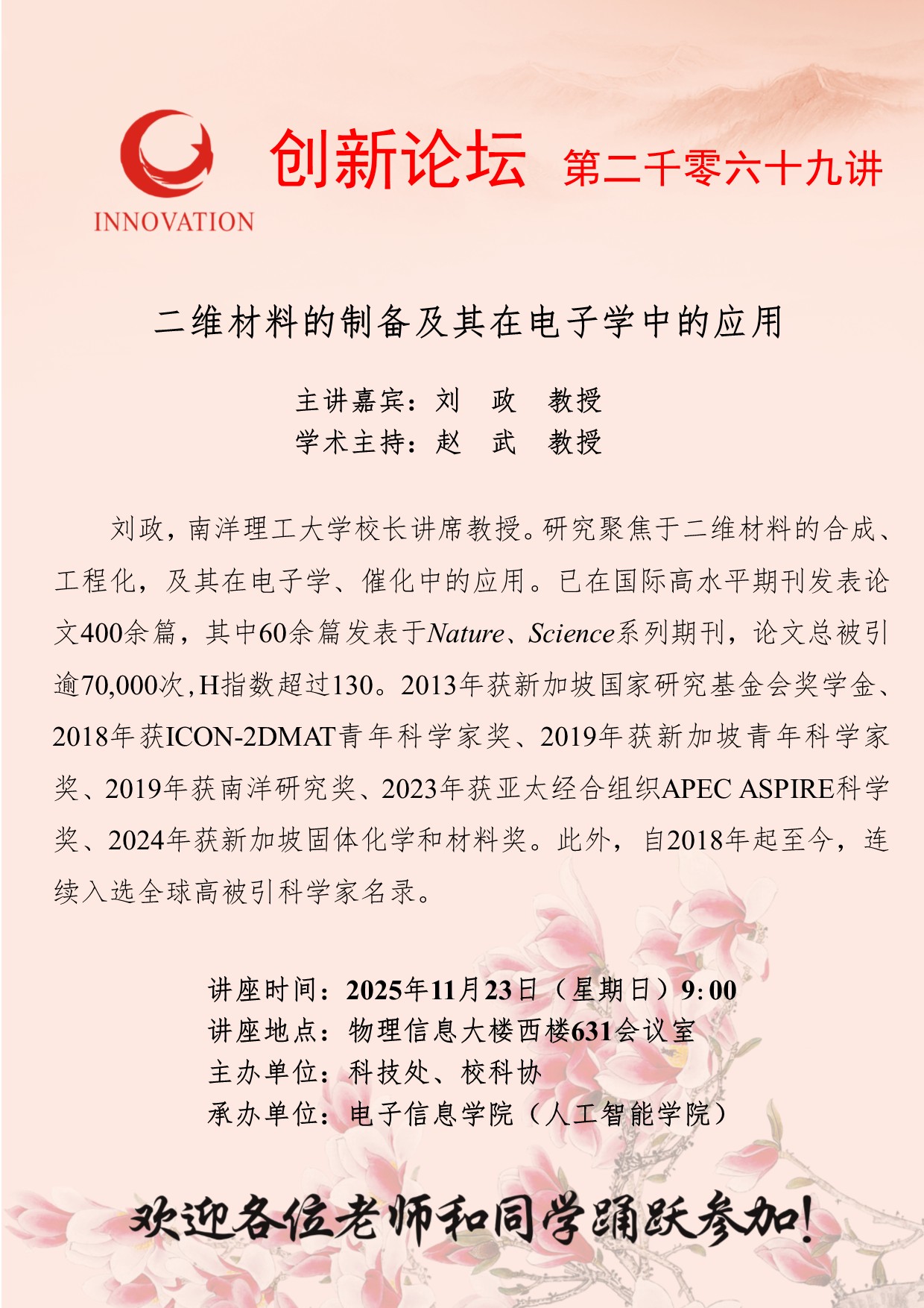 刘政 教授 云博app官方在线入口创新论坛第二千零六十九讲:二维材料的制备及其在电子学中的应用 讲座时间 2025年11月23日(星期日)9:00 讲座地点 物理信息大楼西楼631会议室 讲座人介绍 刘政 教授 讲座内容