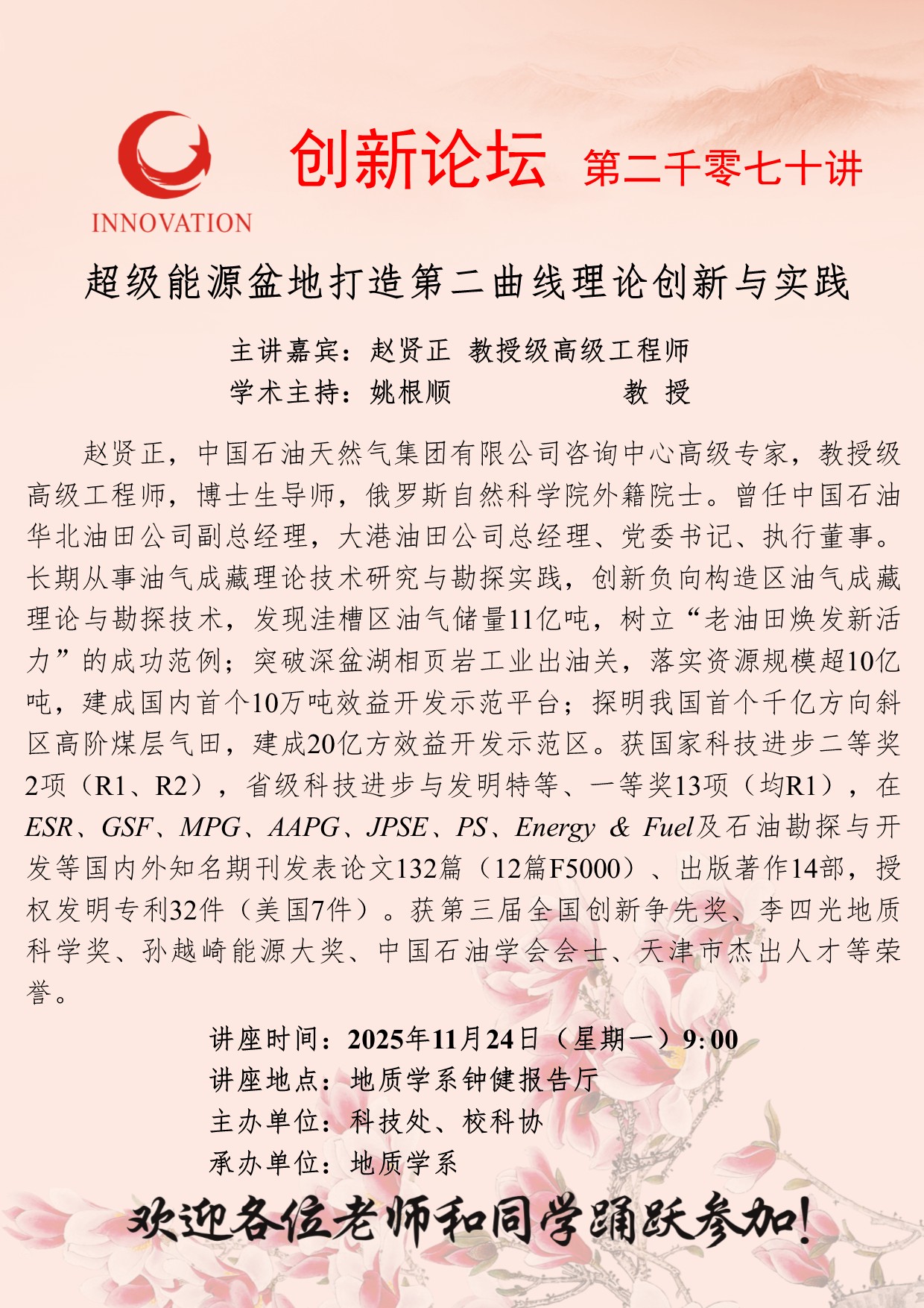 赵贤正 教授级高级工程师 云博app官方在线入口创新论坛第二千零七十讲:超级能源盆地打造第二曲线理论创新与实践 讲座时间 2025年11月24日(星期一)9:00 讲座地点 地质学系钟健报告厅 讲座人介绍 赵贤正 教授级高级工程师 讲座内容