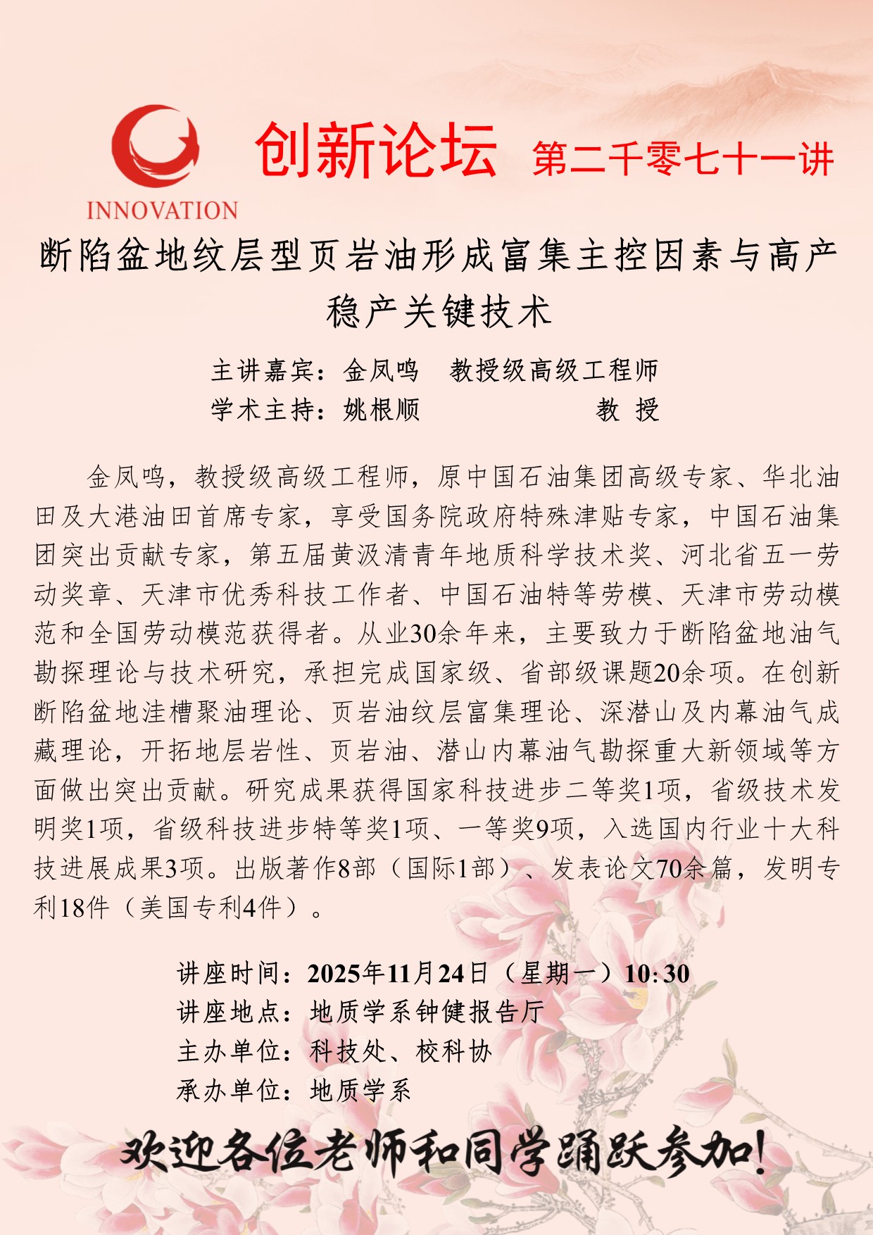 金凤鸣 教授级高级工程师 云博app官方在线入口创新论坛第二千零七十一讲:断陷盆地纹层型页岩油形成富集主控因素与高产稳产关键技术 讲座时间 2025年11月24日(星期一)10:30 讲座地点 地质学系钟健报告厅 讲座人介绍 金凤鸣 教授级高级工程师 讲座内容
