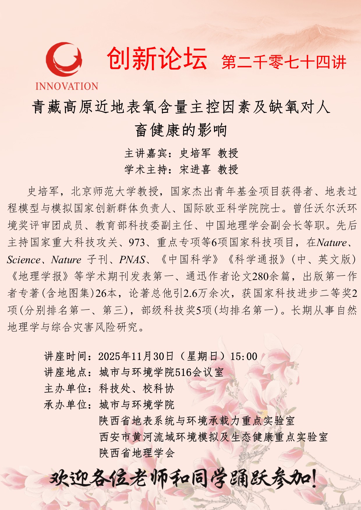 史培军 教授 云博app官方在线入口创新论坛第二千零七十四讲:青藏高原近地表氧含量主控因素及缺氧对人畜健康的影响 讲座时间 2025年11月30日(星期日)15:00 讲座地点 城市与环境学院516会议室 讲座人介绍 史培军 教授 讲座内容