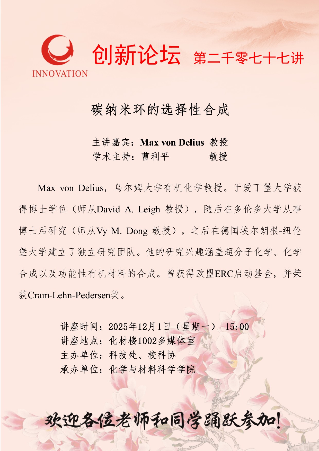 Max von Delius 教授 云博app官方在线入口创新论坛第二千零七十七讲:碳纳米环的选择性合成 讲座时间 2025年12月1日(星期一) 15:00 讲座地点 化材楼1002多媒体室 讲座人介绍 Max von Delius 教授 讲座内容