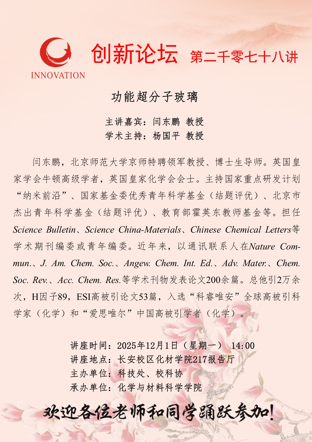 闫东鹏 教授 云博app官方在线入口创新论坛第二千零七十八讲:功能超分子玻璃 讲座时间 2025年12月1日(星期一) 14:00 讲座地点 长安校区化材学院217报告厅 讲座人介绍 闫东鹏 教授 讲座内容