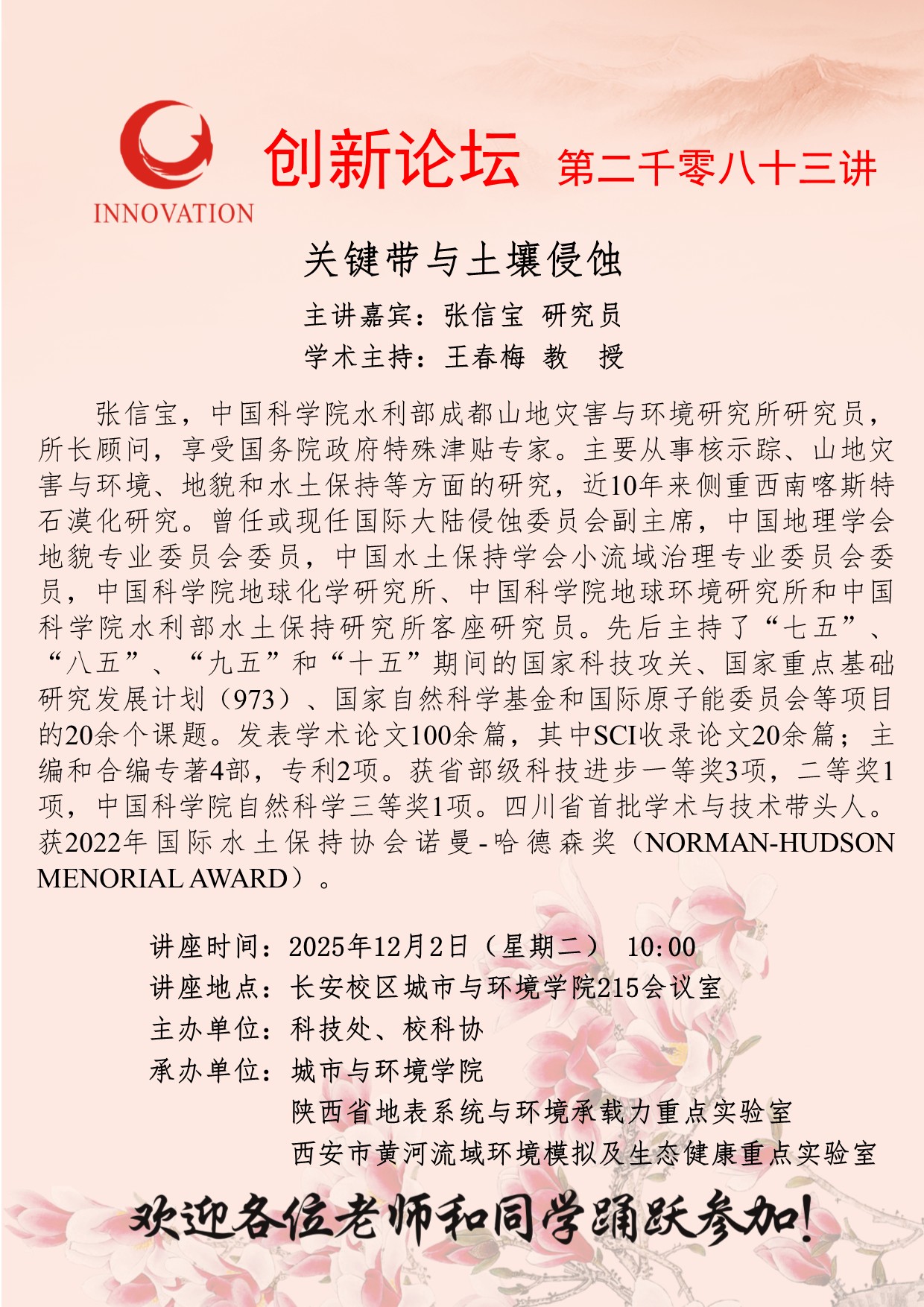 张信宝 研究员 云博app官方在线入口创新论坛第二千零八十三讲:关键带与土壤侵蚀 讲座时间 2025年12月02日(星期二) 10:00 讲座地点 长安校区城市与环境学院215会议室 讲座人介绍 张信宝 研究员 讲座内容