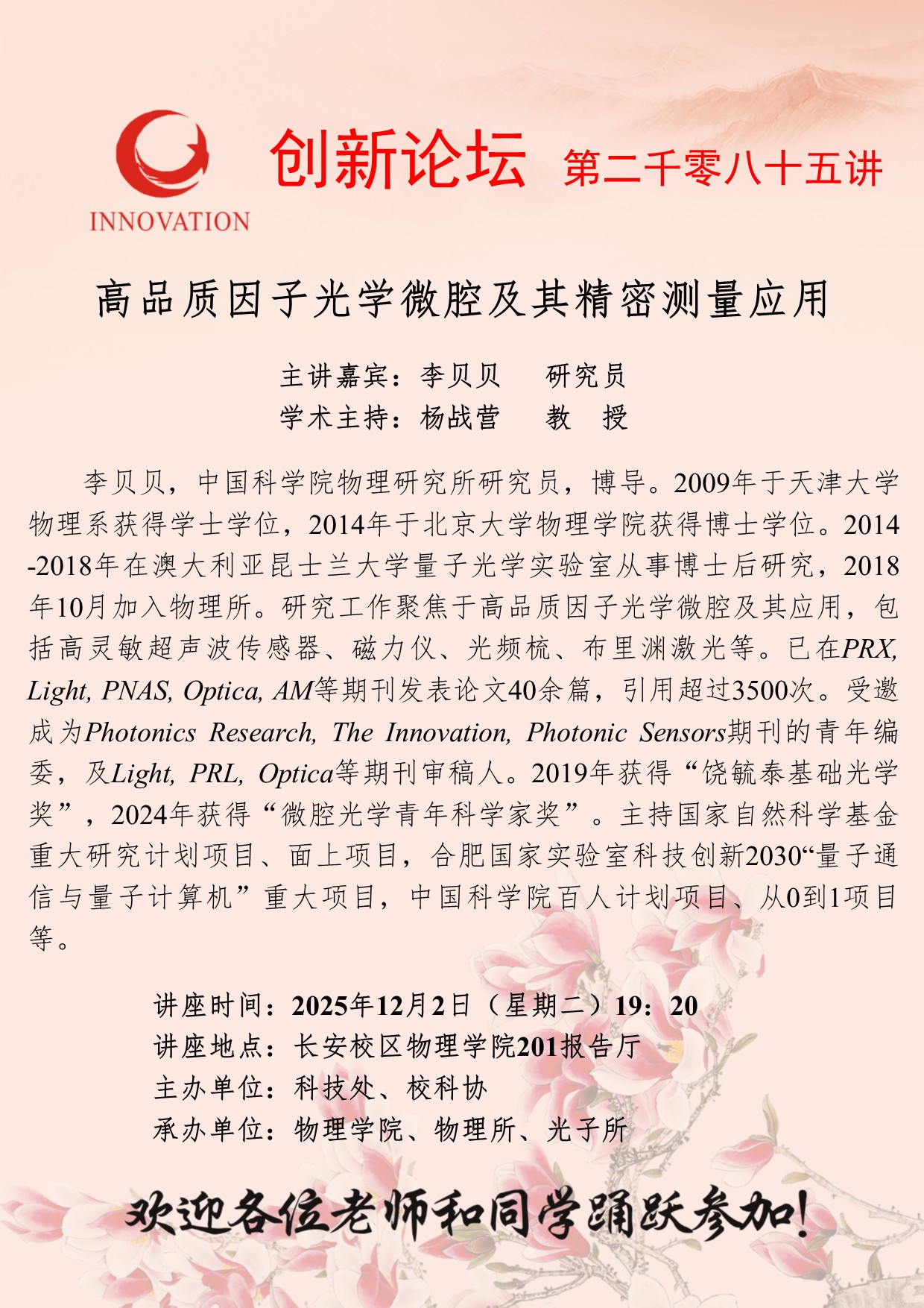 李贝贝 研究员 云博app官方在线入口创新论坛第二千零八十五讲:高品质因子光学微腔及其精密测量应用 讲座时间 2025年12月2日(星期二)19:20 讲座地点 长安校区物理学院201报告厅 讲座人介绍 李贝贝 研究员 讲座内容