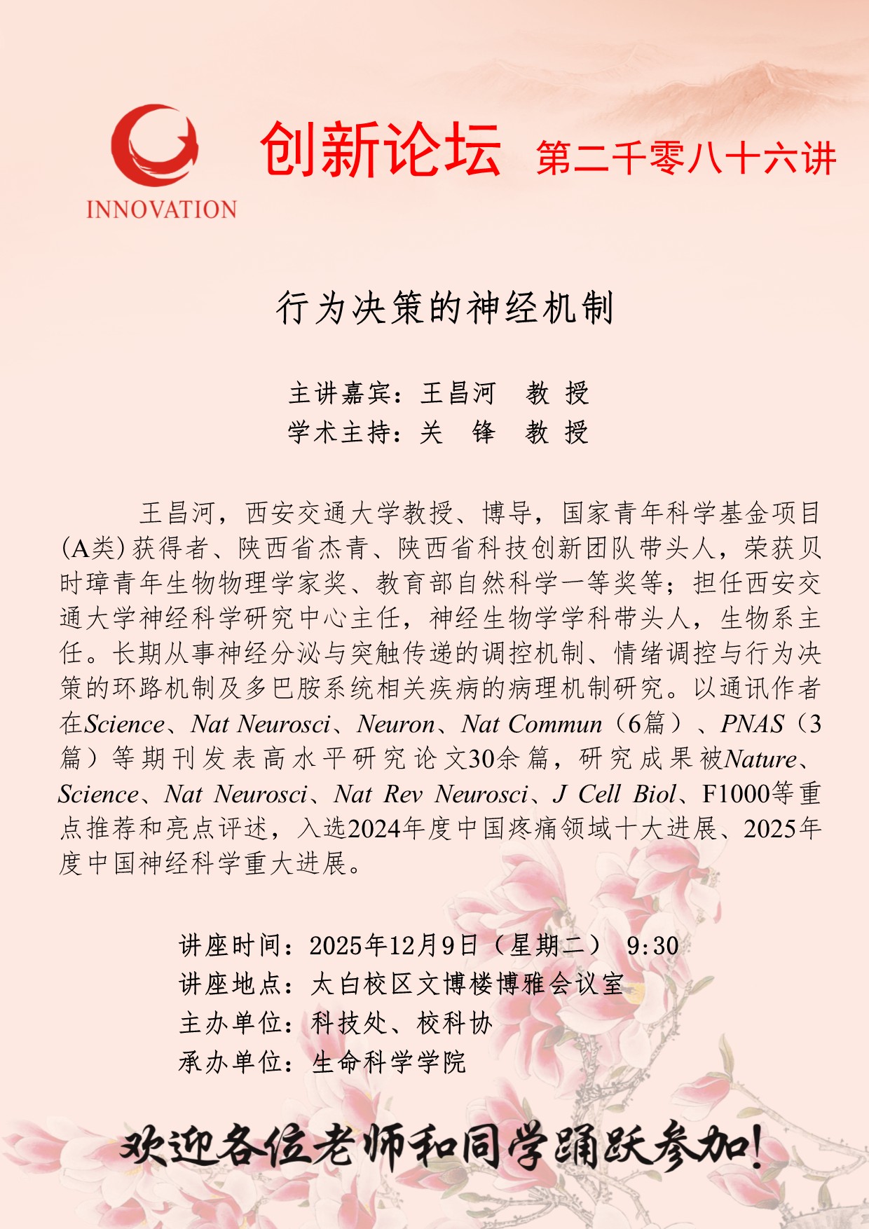 王昌河 教授 云博app官方在线入口创新论坛第二千零八十六讲:行为决策的神经机制 讲座时间 2025年12月9日(星期二) 9:30 讲座地点 太白校区文博楼博雅会议室 讲座人介绍 王昌河 教授 讲座内容
