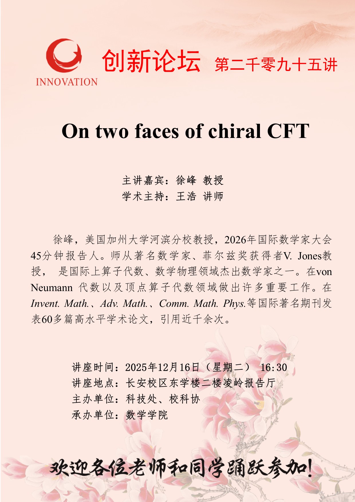 徐峰 教授 云博app官方在线入口创新论坛第二千零九十五讲:On two faces of chiral CFT 讲座时间 2025年12月16日(星期二) 16:30 讲座地点 长安校区东学楼二楼凌岭报告厅 讲座人介绍 徐峰 教授 讲座内容