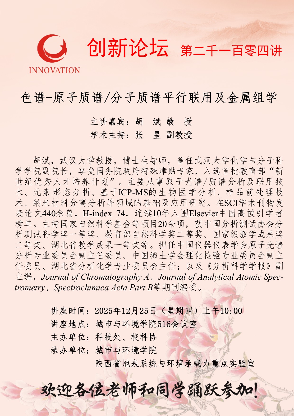 胡斌 教授 云博app官方在线入口创新论坛第二千一百零四讲:色谱-原子质谱/分子质谱平行联用及金属组学 讲座时间 2025年12月25日(星期四)上午10:00 讲座地点 城市与环境学院516会议室 讲座人介绍 胡斌 教授 讲座内容