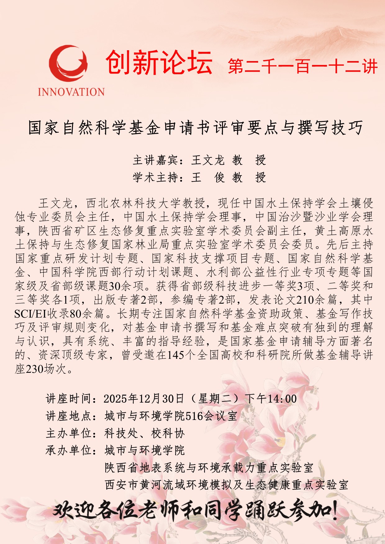 王文龙 教授 云博app官方在线入口创新论坛第二千一百一十二讲:国家自然科学基金申请书评审要点与撰写技巧 讲座时间 2025年12月30日(星期二)下午14:00 讲座地点 城市与环境学院516会议室 讲座人介绍 王文龙 教授 讲座内容