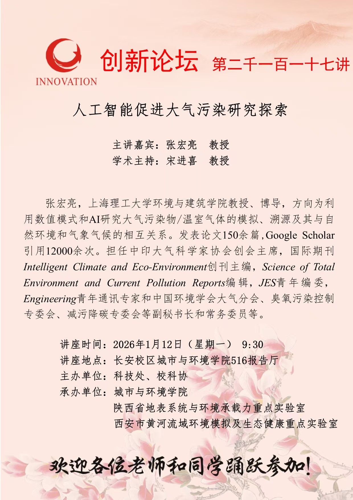 张宏亮 教授 云博app官方在线入口创新论坛第二千一百一十七讲:人工智能促进大气污染研究探索 讲座时间 2026年1月12日(星期一) 9:30 讲座地点 长安校区城市与环境学院516报告厅 讲座人介绍 张宏亮 教授 讲座内容