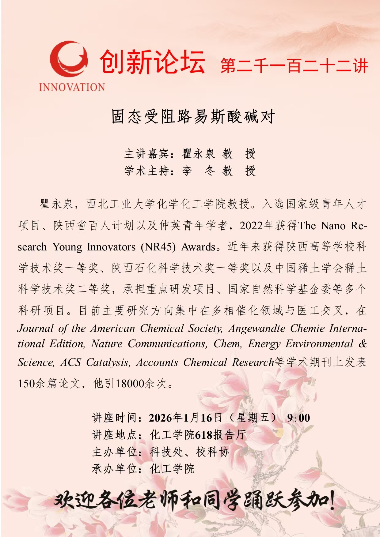 瞿永泉 教 授 云博app官方在线入口创新论坛第二千一百二十二讲:固态受阻路易斯酸碱对 讲座时间 2026年1月16日(星期五) 9:00 讲座地点 化工学院618报告厅 讲座人介绍 瞿永泉 教 授 讲座内容