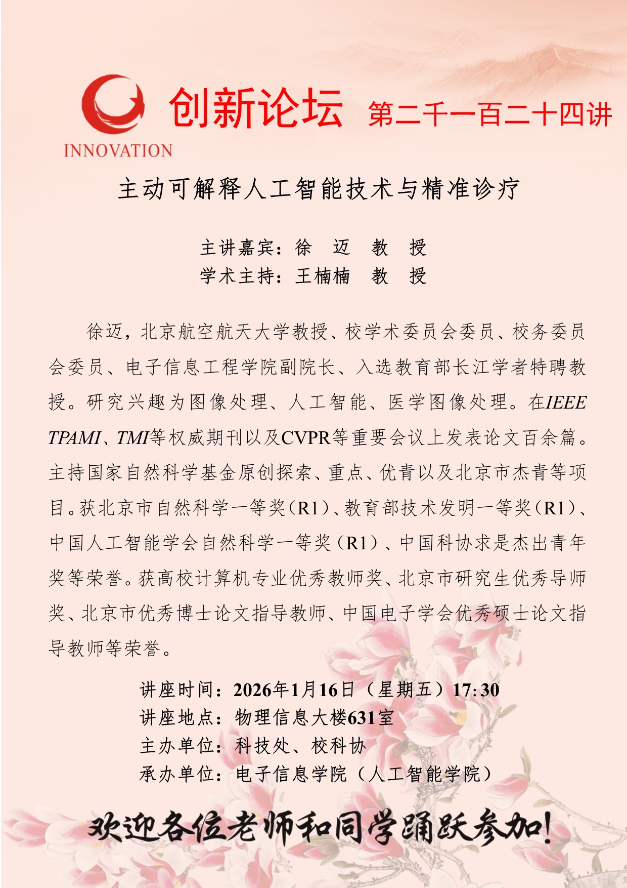 徐迈 教授 云博app官方在线入口创新论坛第二千一百二十四讲:主动可解释人工智能技术与精准诊疗 讲座时间 2026年1月16日(星期五)17:30 讲座地点 物理信息大楼631室 讲座人介绍 徐迈 教授 讲座内容