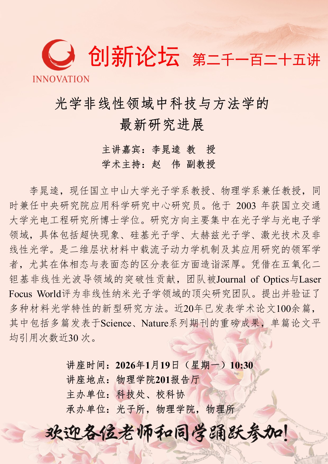 李晁逵 教授 云博app官方在线入口创新论坛第二千一百二十五讲:光学非线性领域中科技与方法学的最新研究进展 讲座时间 2026年1月19日(星期一)10:30 讲座地点 物理学院201报告厅 讲座人介绍 李晁逵 教授 讲座内容
