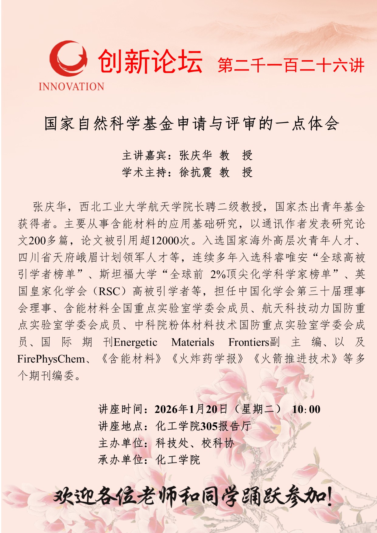 张庆华 教授 云博app官方在线入口创新论坛第二千一百二十六讲:国家自然科学基金申请与评审的一点体会 讲座时间 2026年1月20日(星期二) 10:00 讲座地点 化工学院305报告厅 讲座人介绍 张庆华 教授 讲座内容